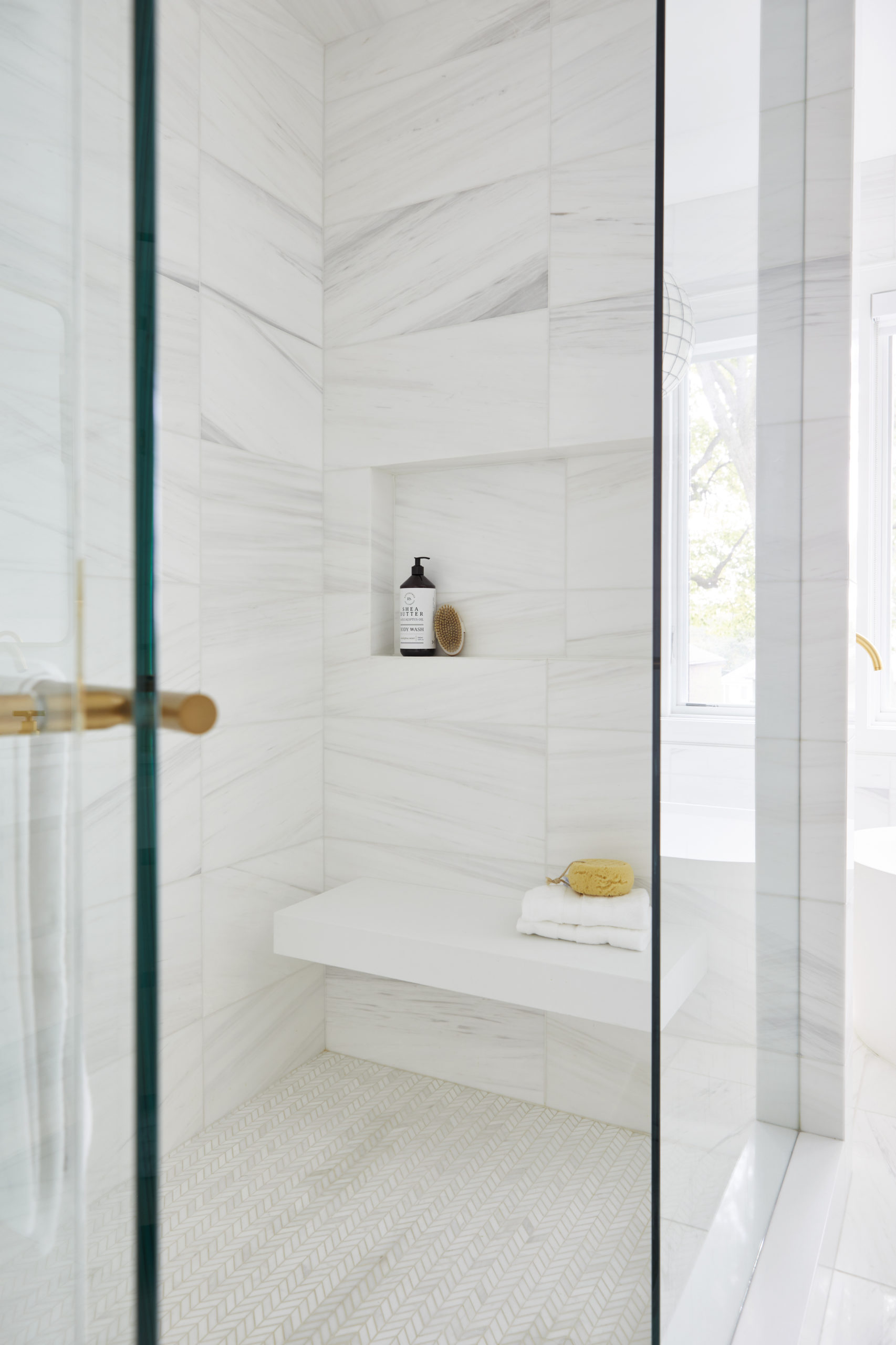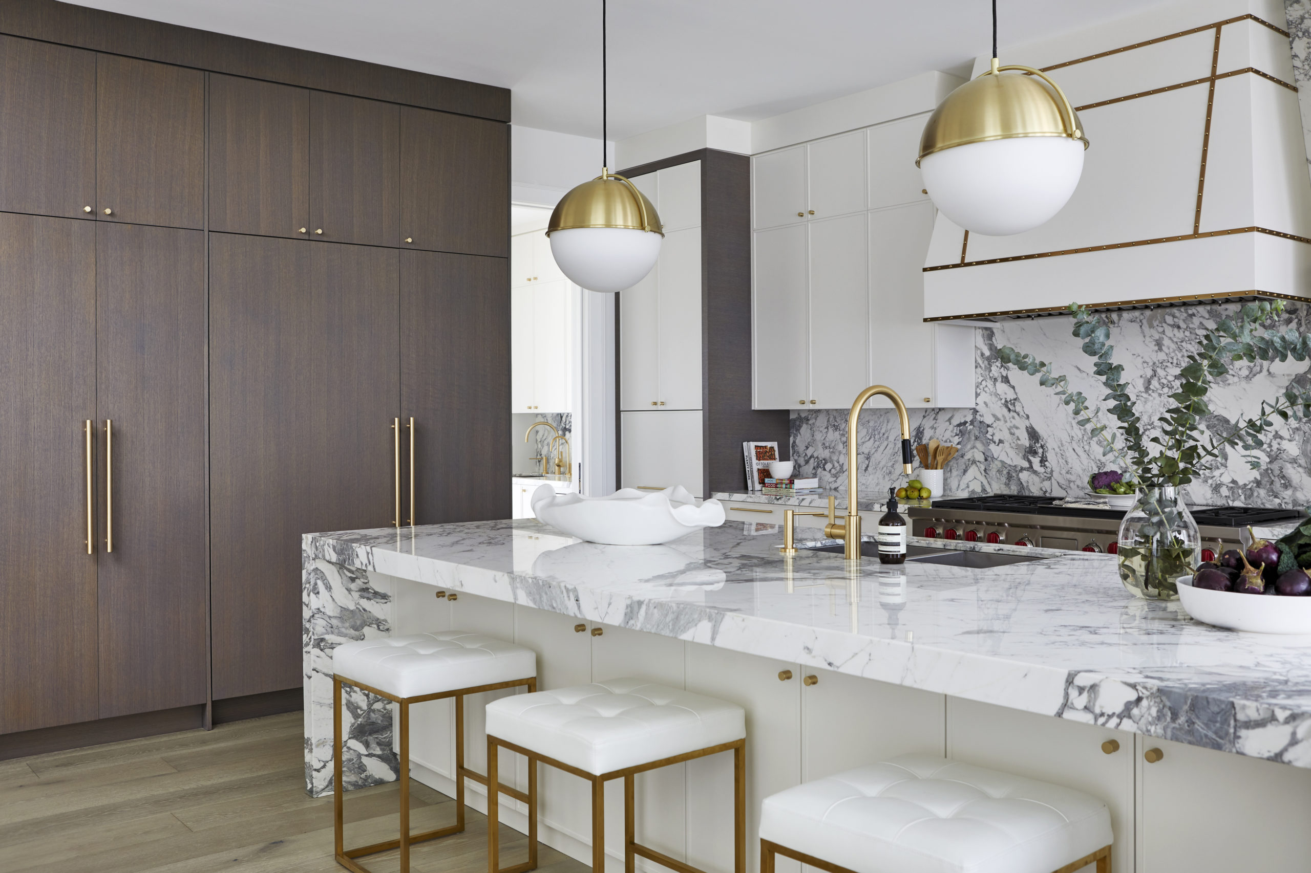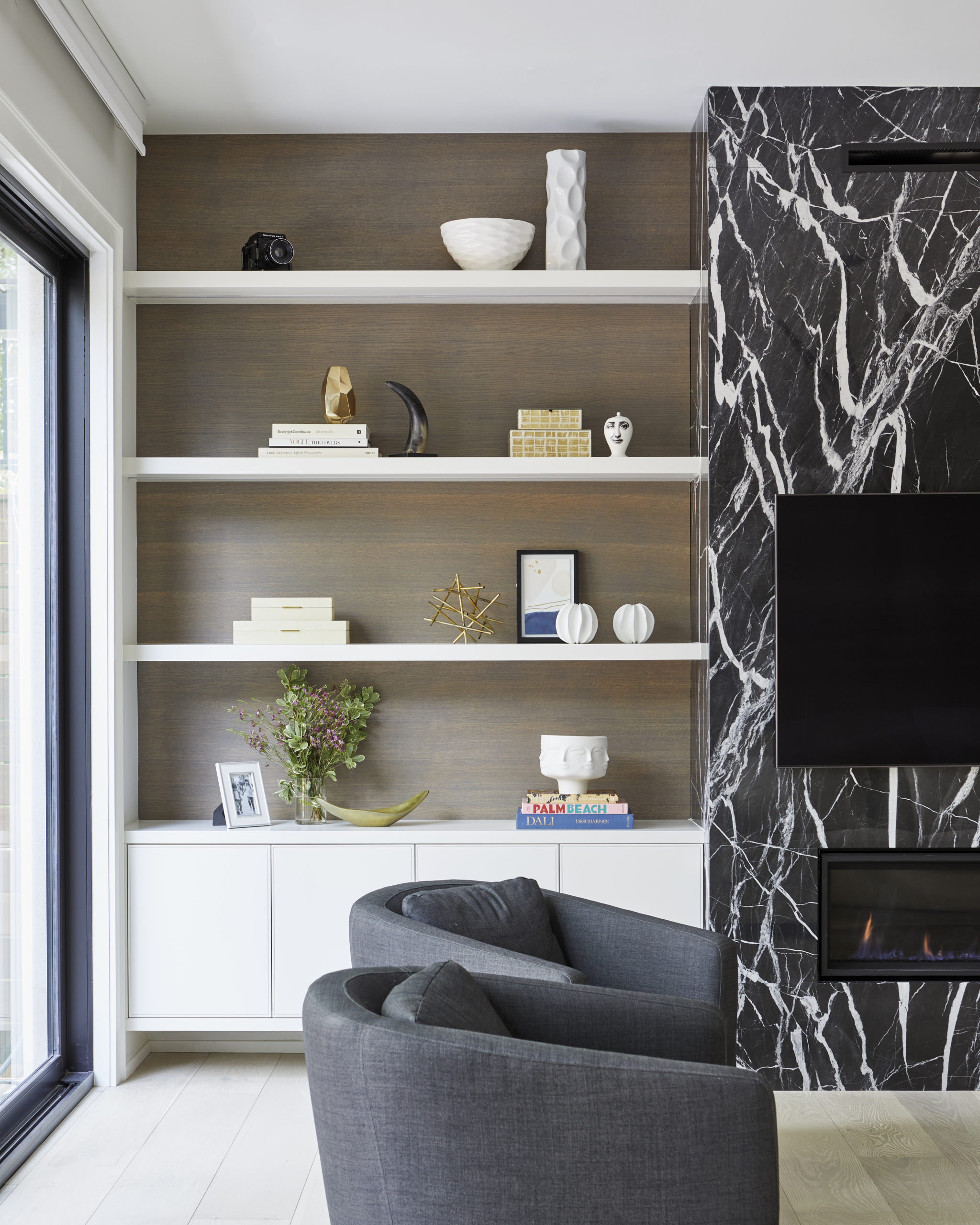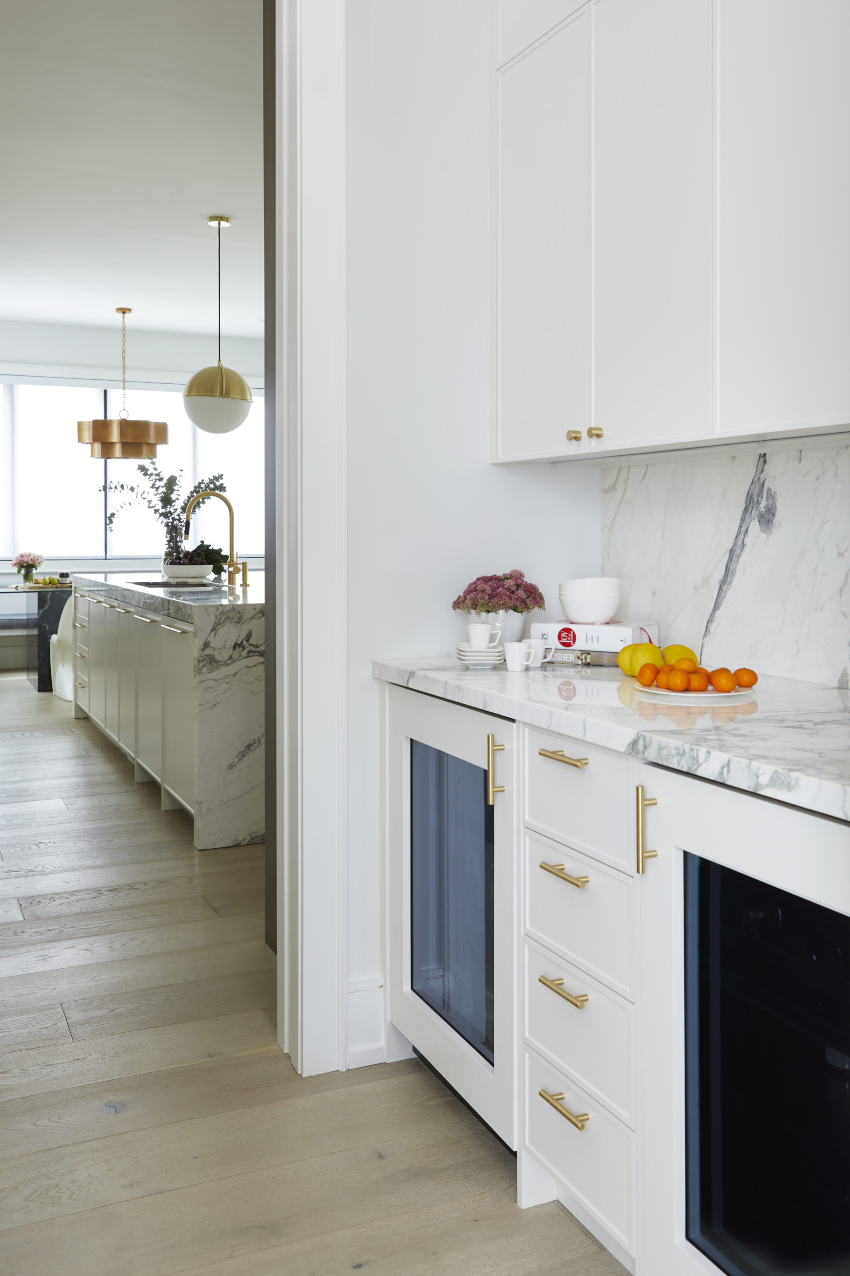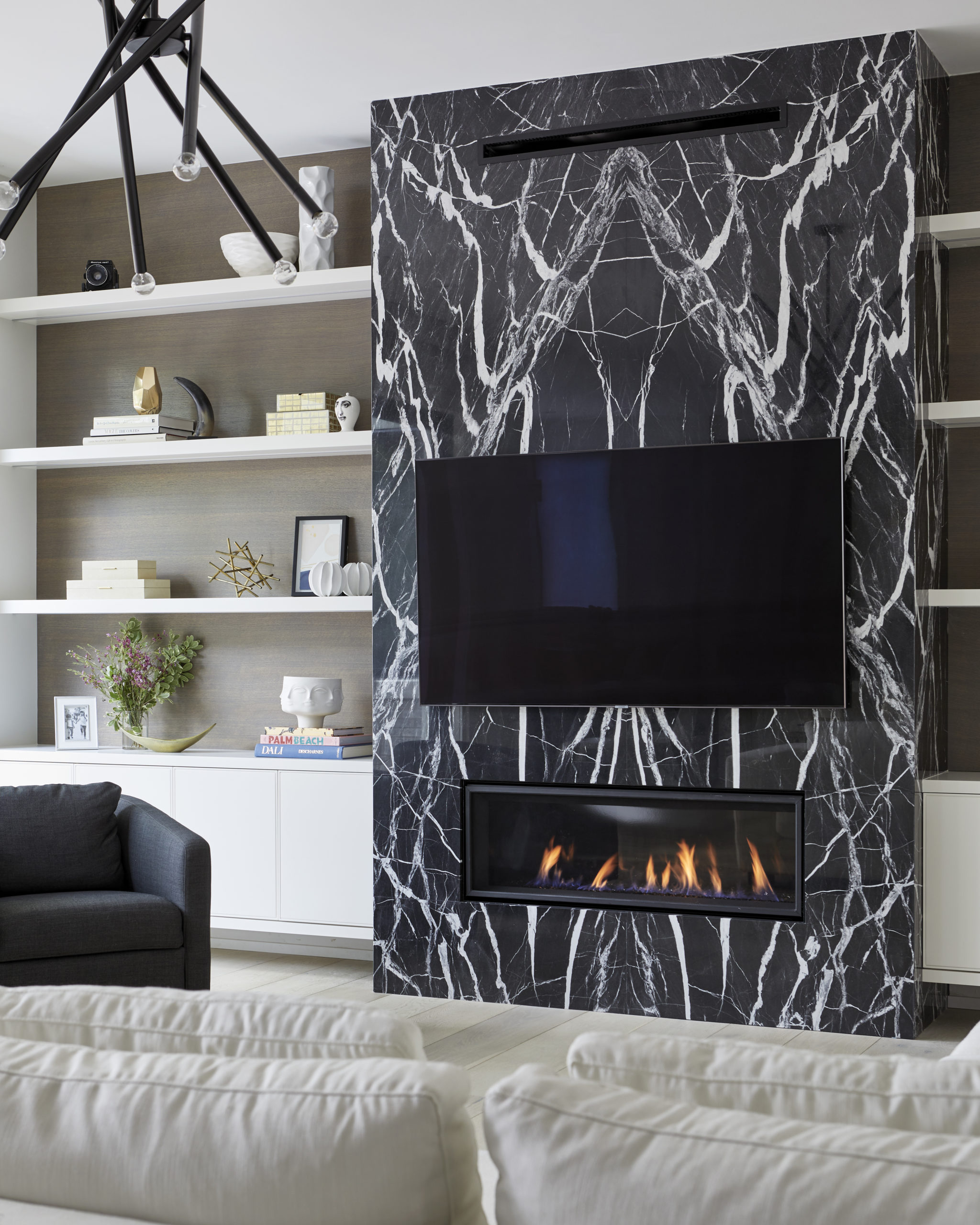 In this expansive 5,000+ sq ft new build, a sleek, modern vision comes to life through a crisp white palette accented by bold dark details and warm brass touches. The kitchen stuns with bright natural stone with linear veins wrapping the countertops, waterfall island, and backsplash, while charcoal-stained wood injects drama and depth. Just opposite, a striking Nero Marquina, black-and-white stone fireplace becomes a timeless focal point. Chevron floors sweep through the corridors, drawing the eye forward with dynamic elegance. In the primary ensuite, fresh white marble envelops the space from floor to ceiling, where minimalist detailing allows the refined materials and thoughtful finishes to quietly command attention.