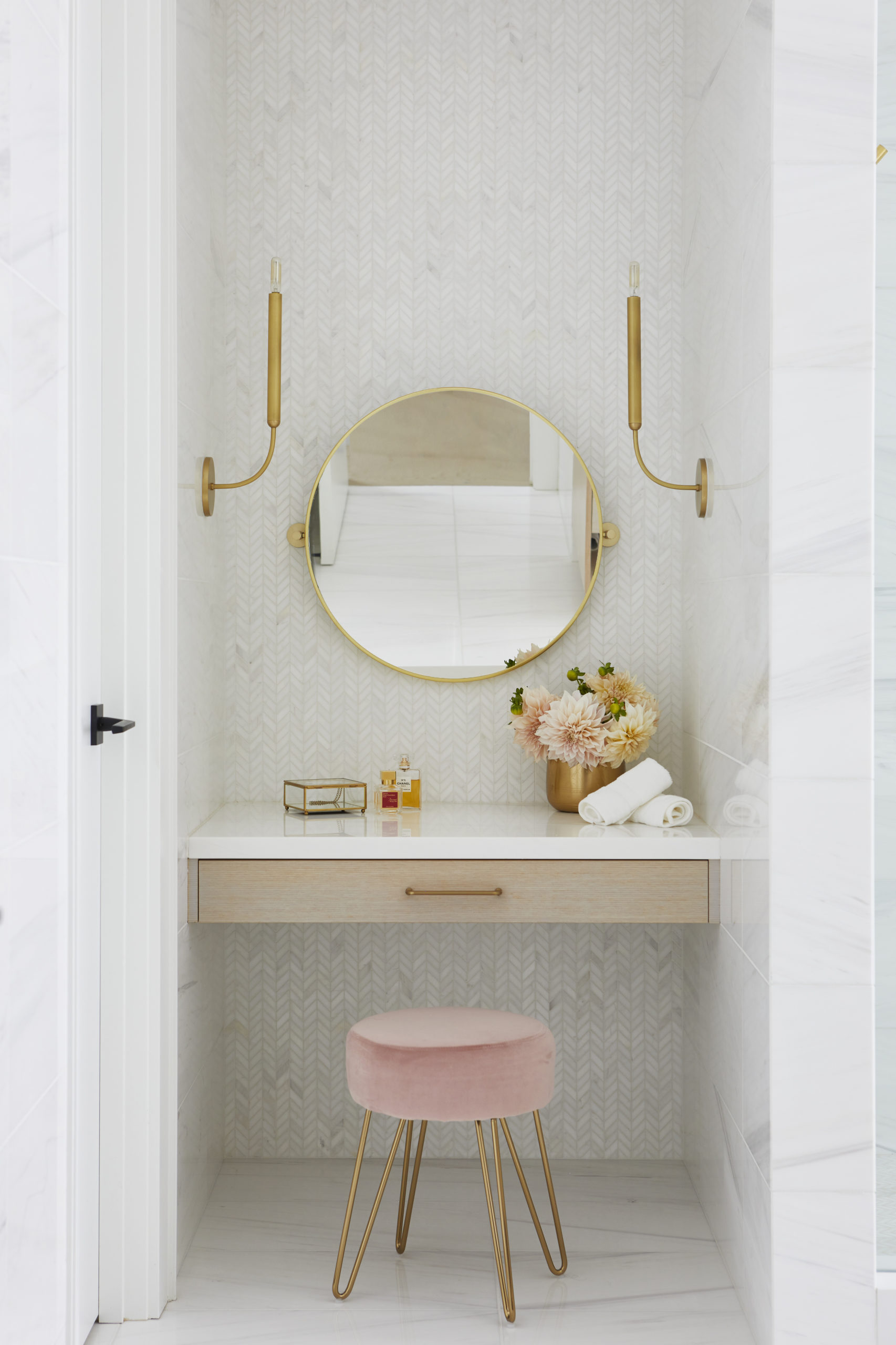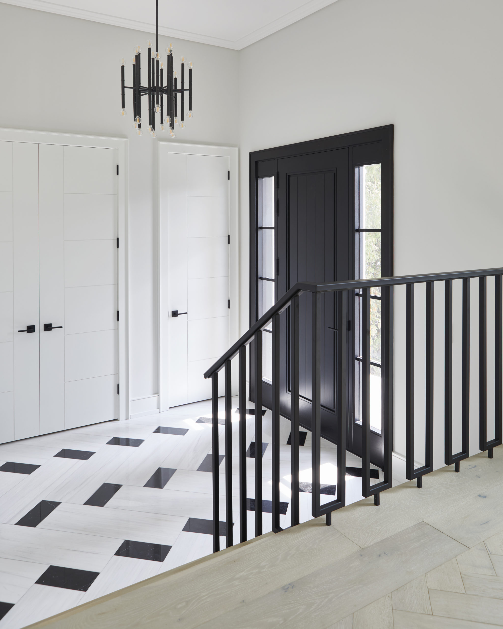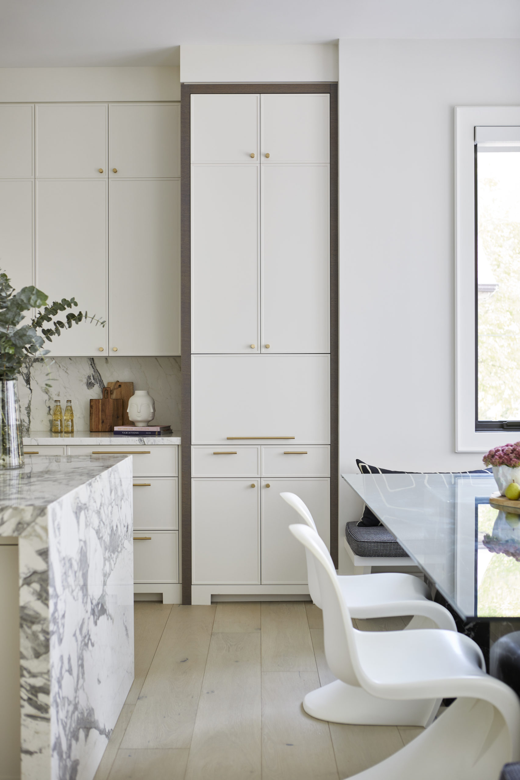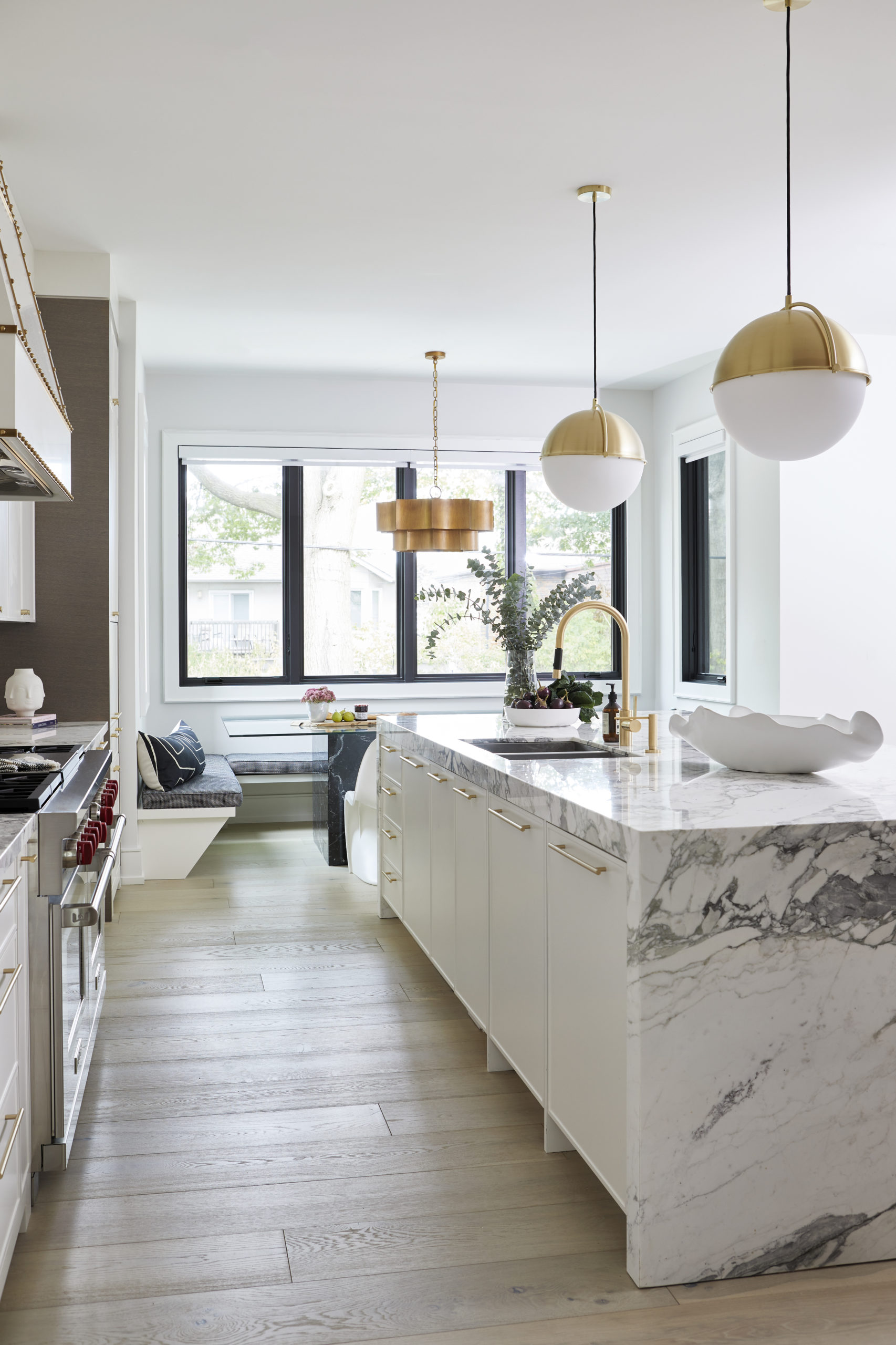 In this expansive 5,000+ sq ft new build, a sleek, modern vision comes to life through a crisp white palette accented by bold dark details and warm brass touches. The kitchen stuns with bright natural stone with linear veins wrapping the countertops, waterfall island, and backsplash, while charcoal-stained wood injects drama and depth. Just opposite, a striking Nero Marquina, black-and-white stone fireplace becomes a timeless focal point. Chevron floors sweep through the corridors, drawing the eye forward with dynamic elegance. In the primary ensuite, fresh white marble envelops the space from floor to ceiling, where minimalist detailing allows the refined materials and thoughtful finishes to quietly command attention.