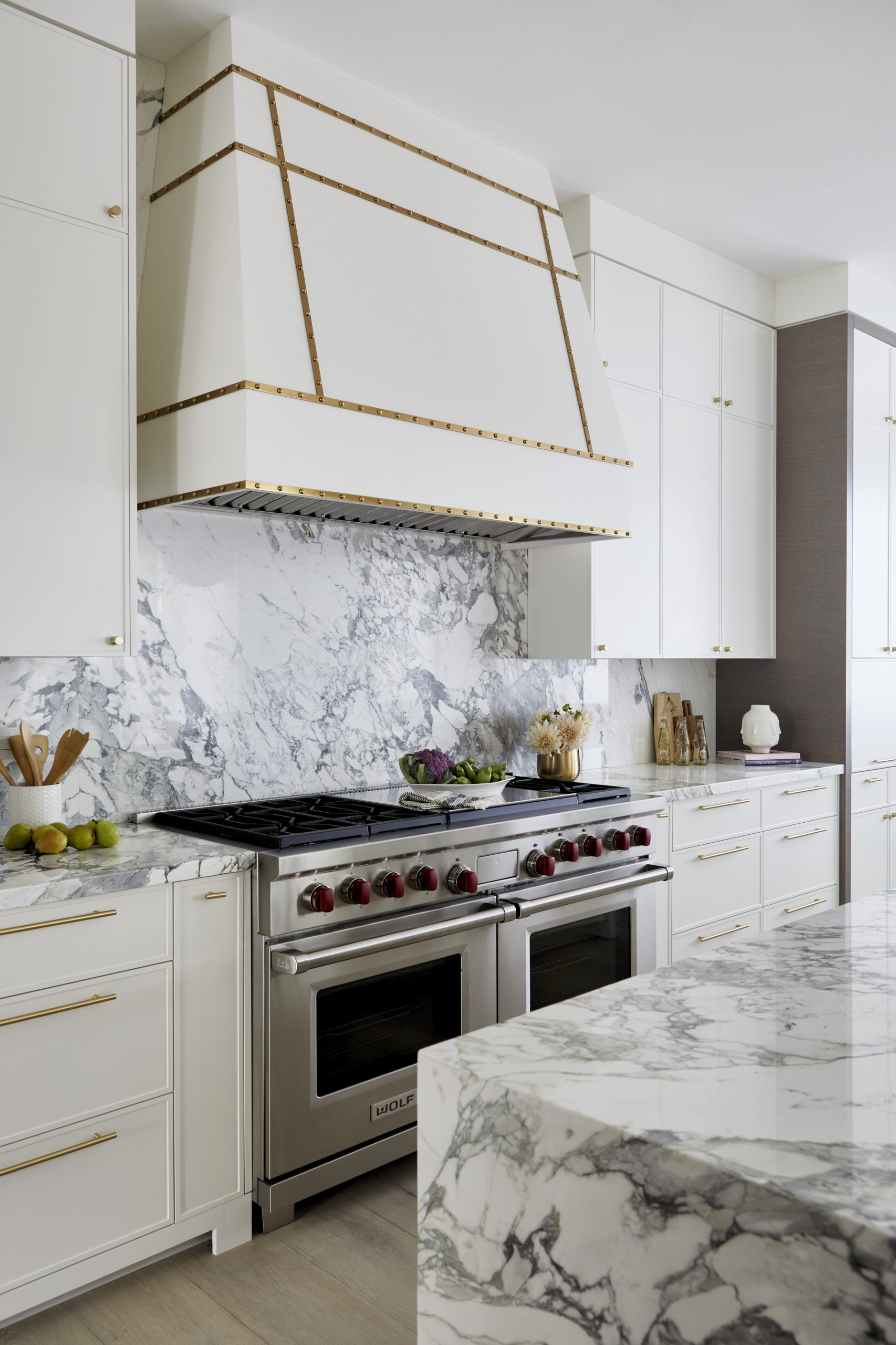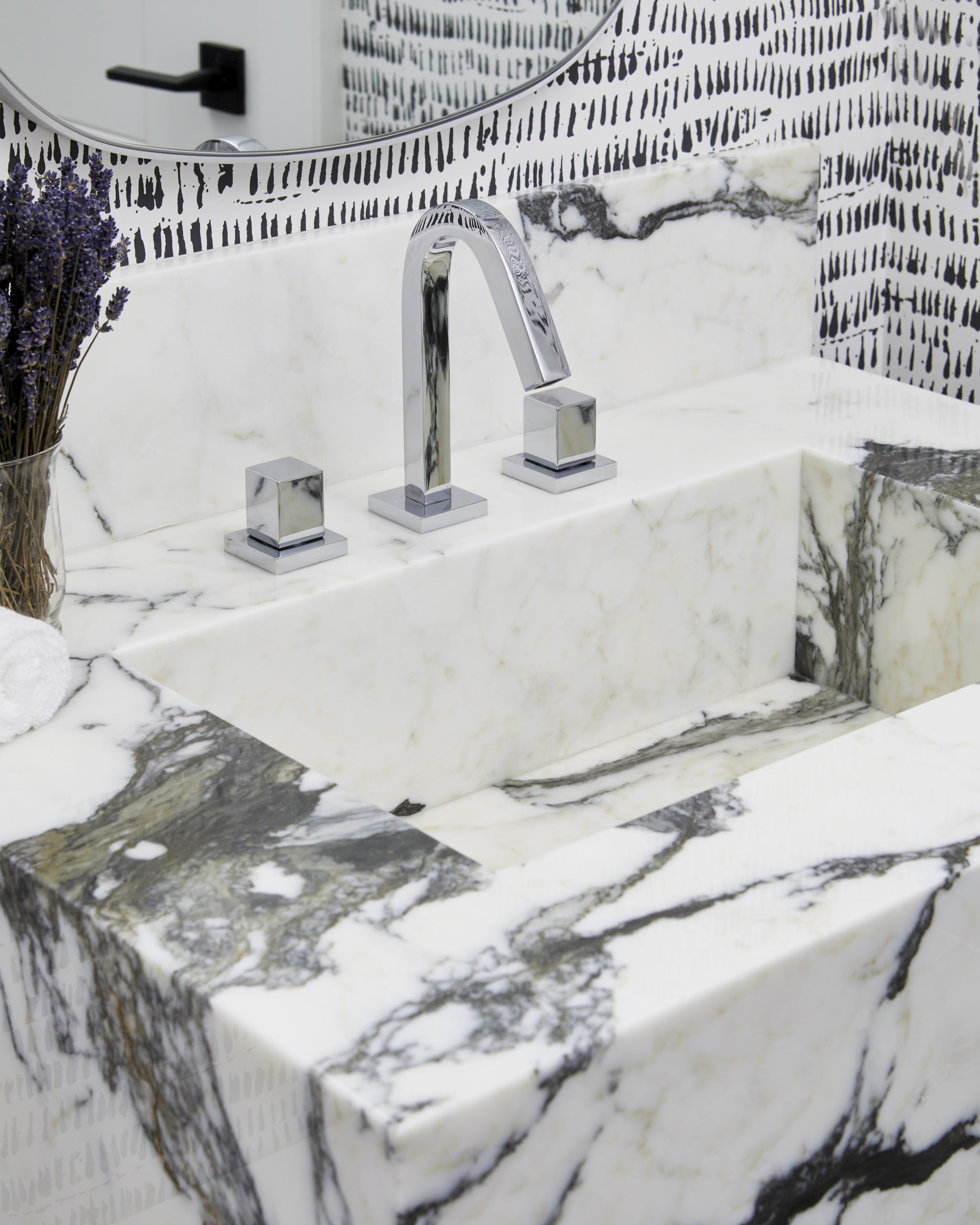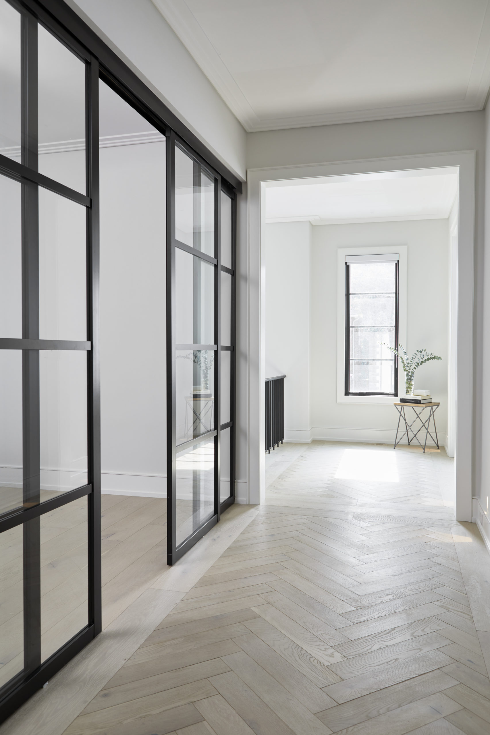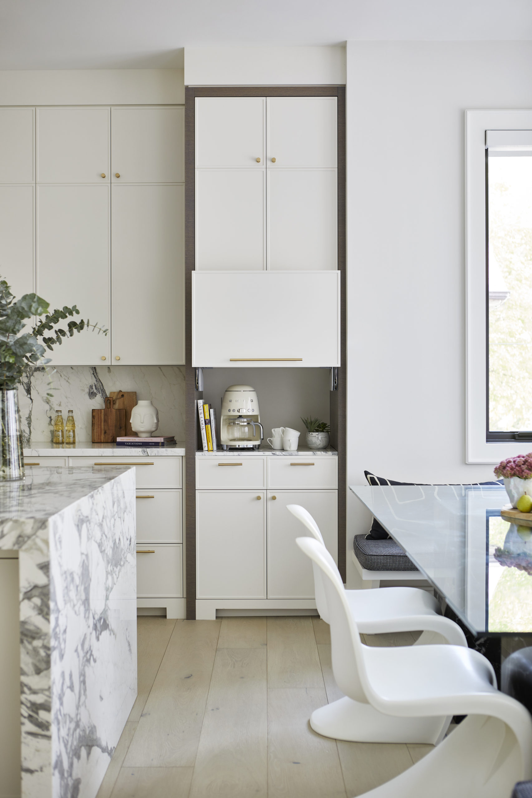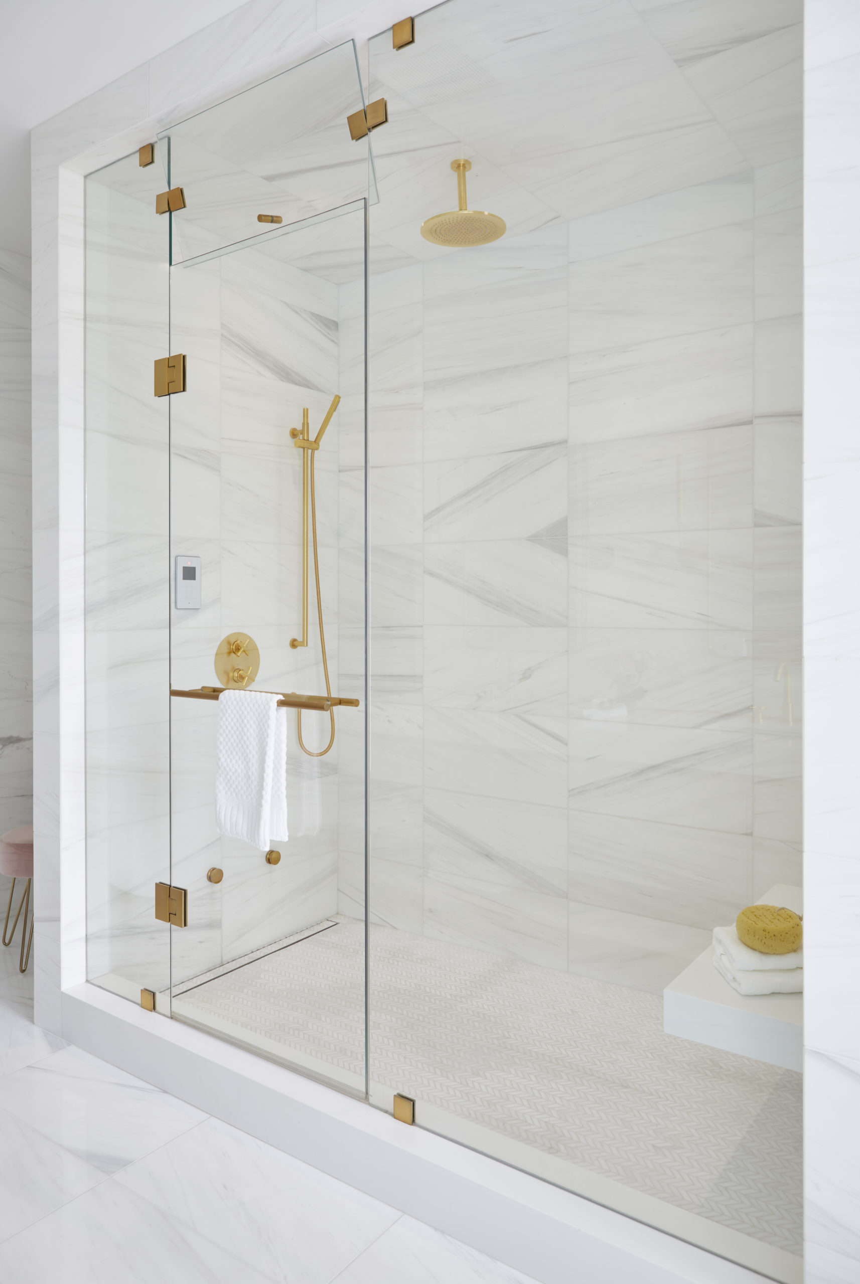 In this expansive 5,000+ sq ft new build, a sleek, modern vision comes to life through a crisp white palette accented by bold dark details and warm brass touches. The kitchen stuns with bright natural stone with linear veins wrapping the countertops, waterfall island, and backsplash, while charcoal-stained wood injects drama and depth. Just opposite, a striking Nero Marquina, black-and-white stone fireplace becomes a timeless focal point. Chevron floors sweep through the corridors, drawing the eye forward with dynamic elegance. In the primary ensuite, fresh white marble envelops the space from floor to ceiling, where minimalist detailing allows the refined materials and thoughtful finishes to quietly command attention.