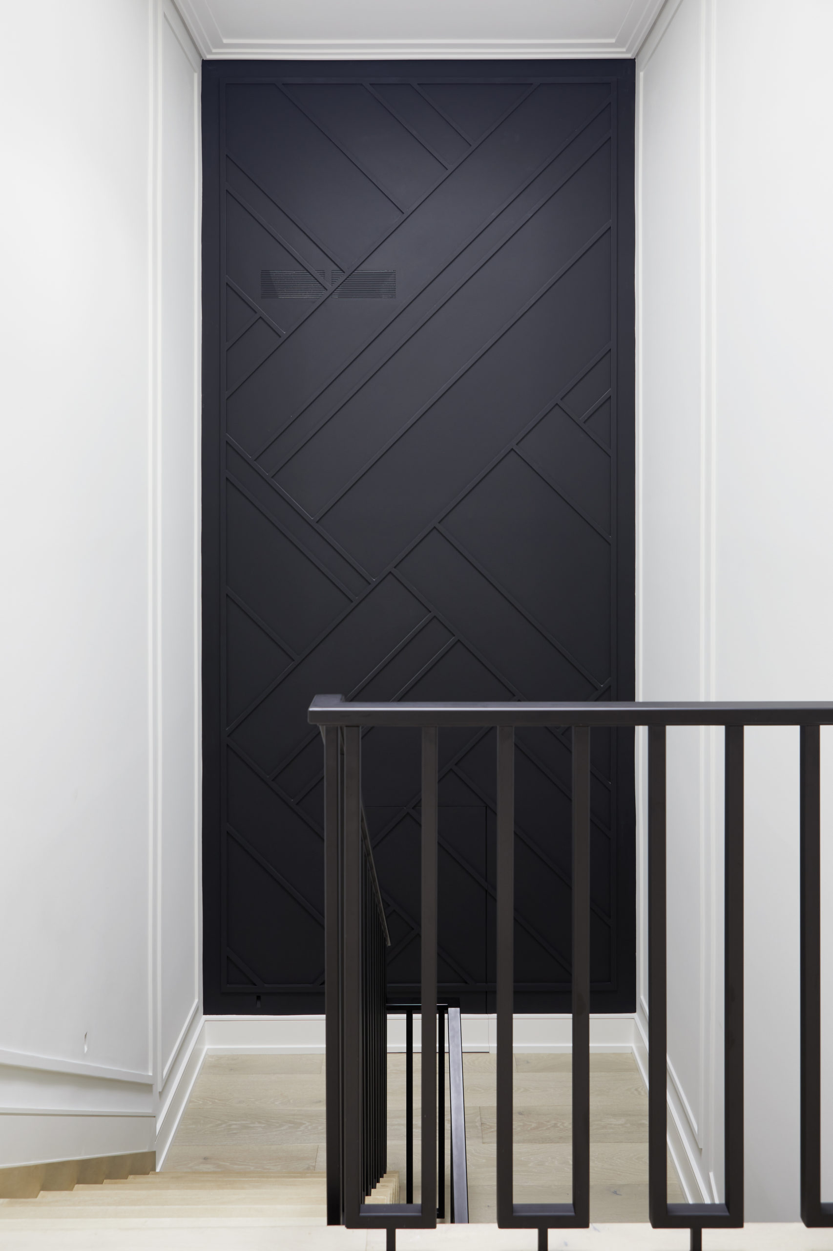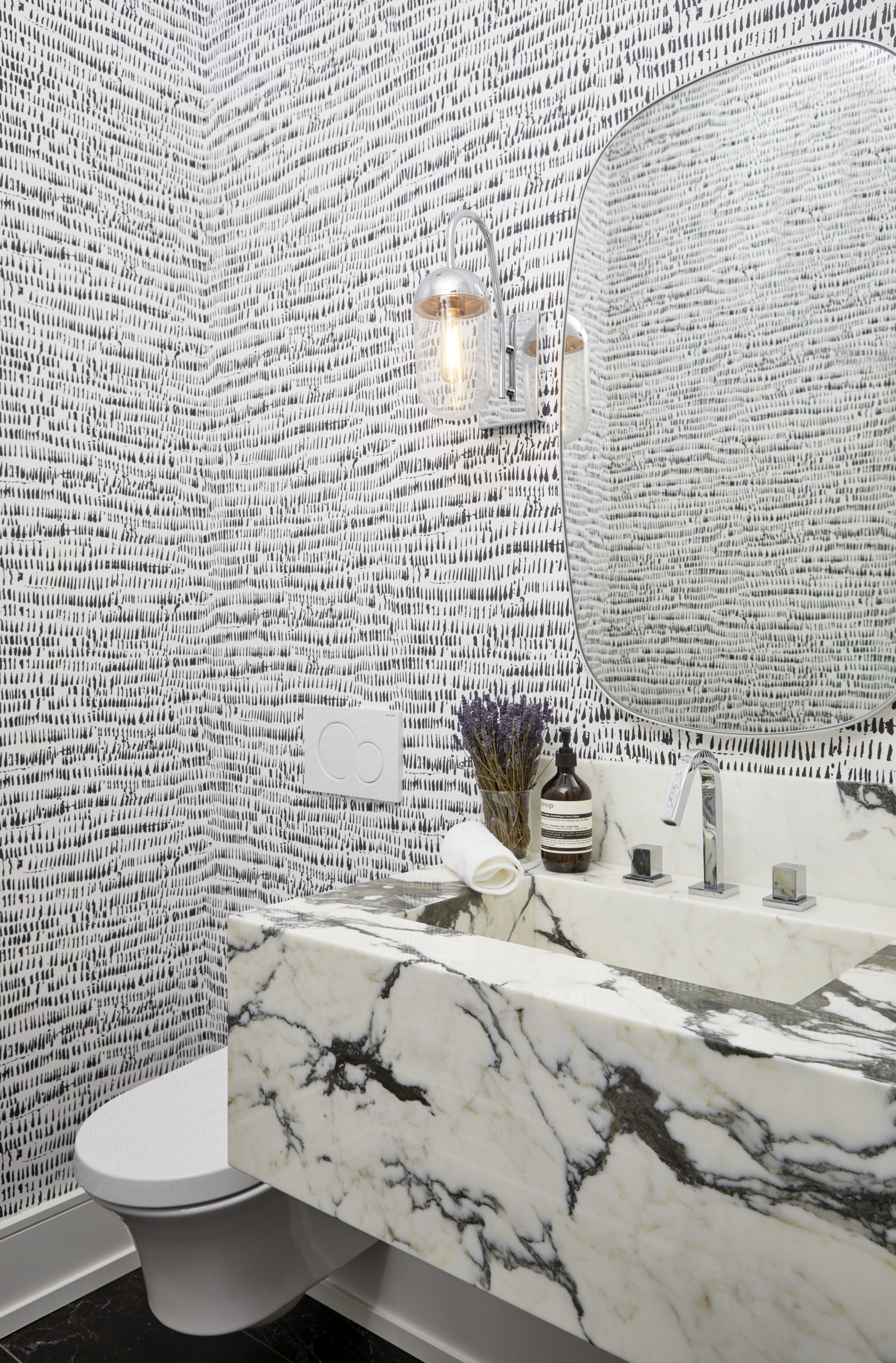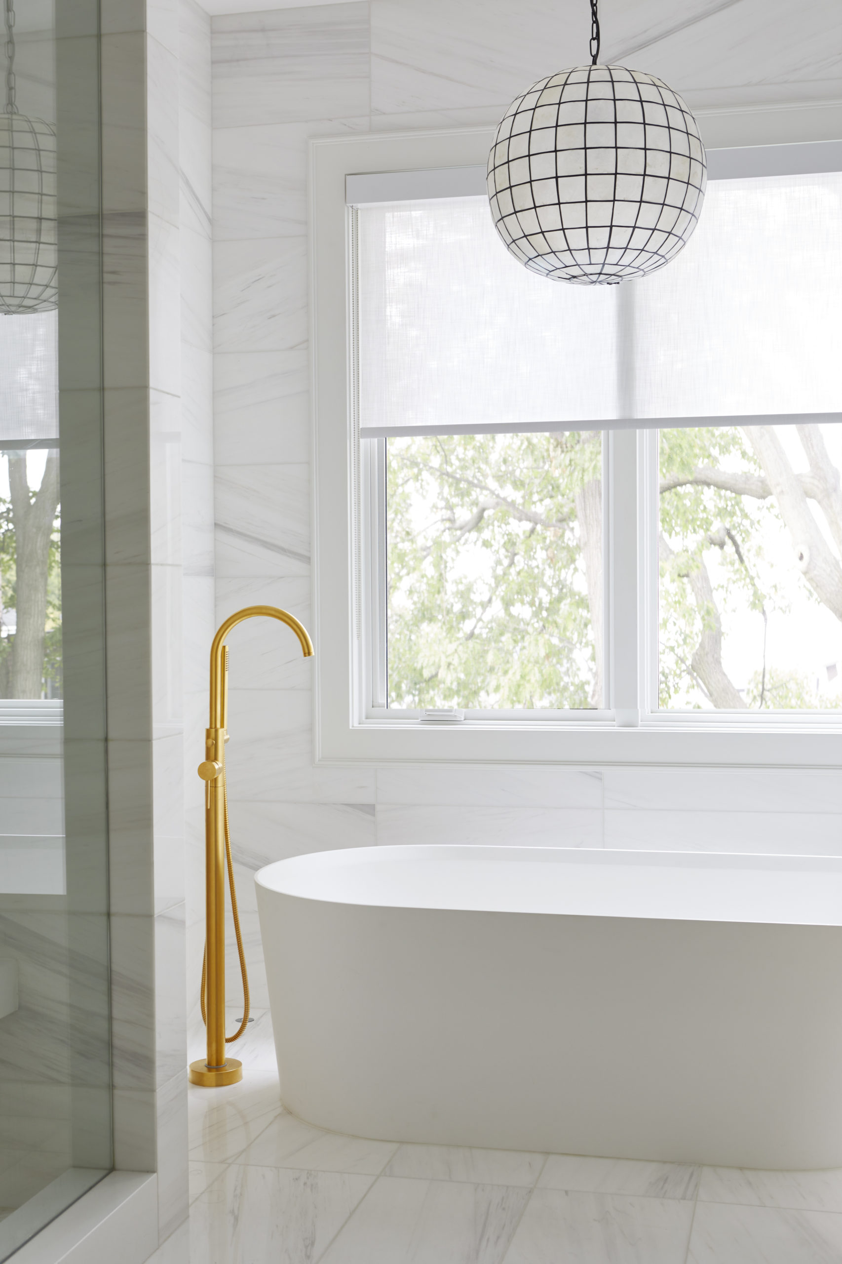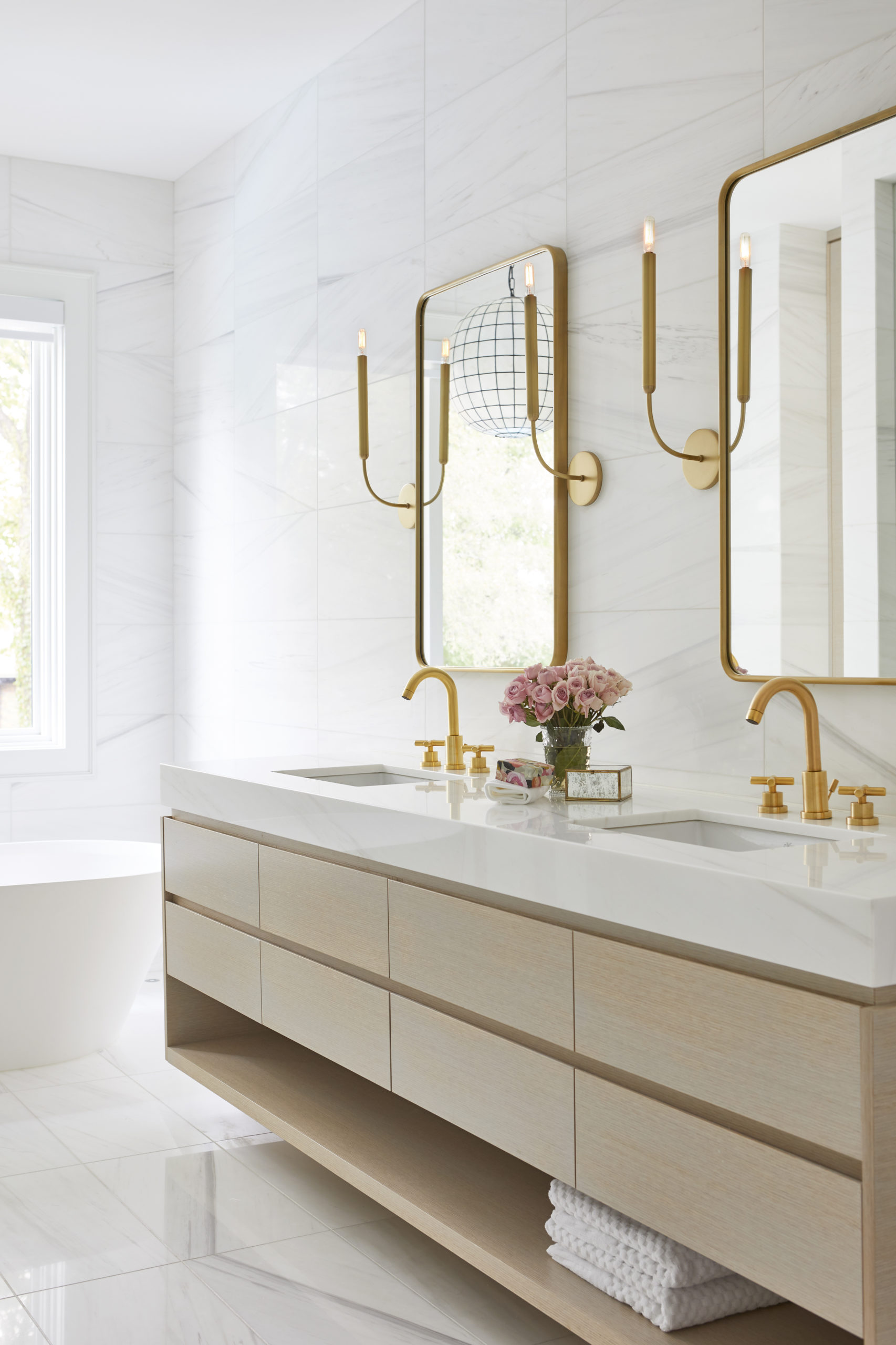 In this expansive 5,000+ sq ft new build, a sleek, modern vision comes to life through a crisp white palette accented by bold dark details and warm brass touches. The kitchen stuns with bright natural stone with linear veins wrapping the countertops, waterfall island, and backsplash, while charcoal-stained wood injects drama and depth. Just opposite, a striking Nero Marquina, black-and-white stone fireplace becomes a timeless focal point. Chevron floors sweep through the corridors, drawing the eye forward with dynamic elegance. In the primary ensuite, fresh white marble envelops the space from floor to ceiling, where minimalist detailing allows the refined materials and thoughtful finishes to quietly command attention.