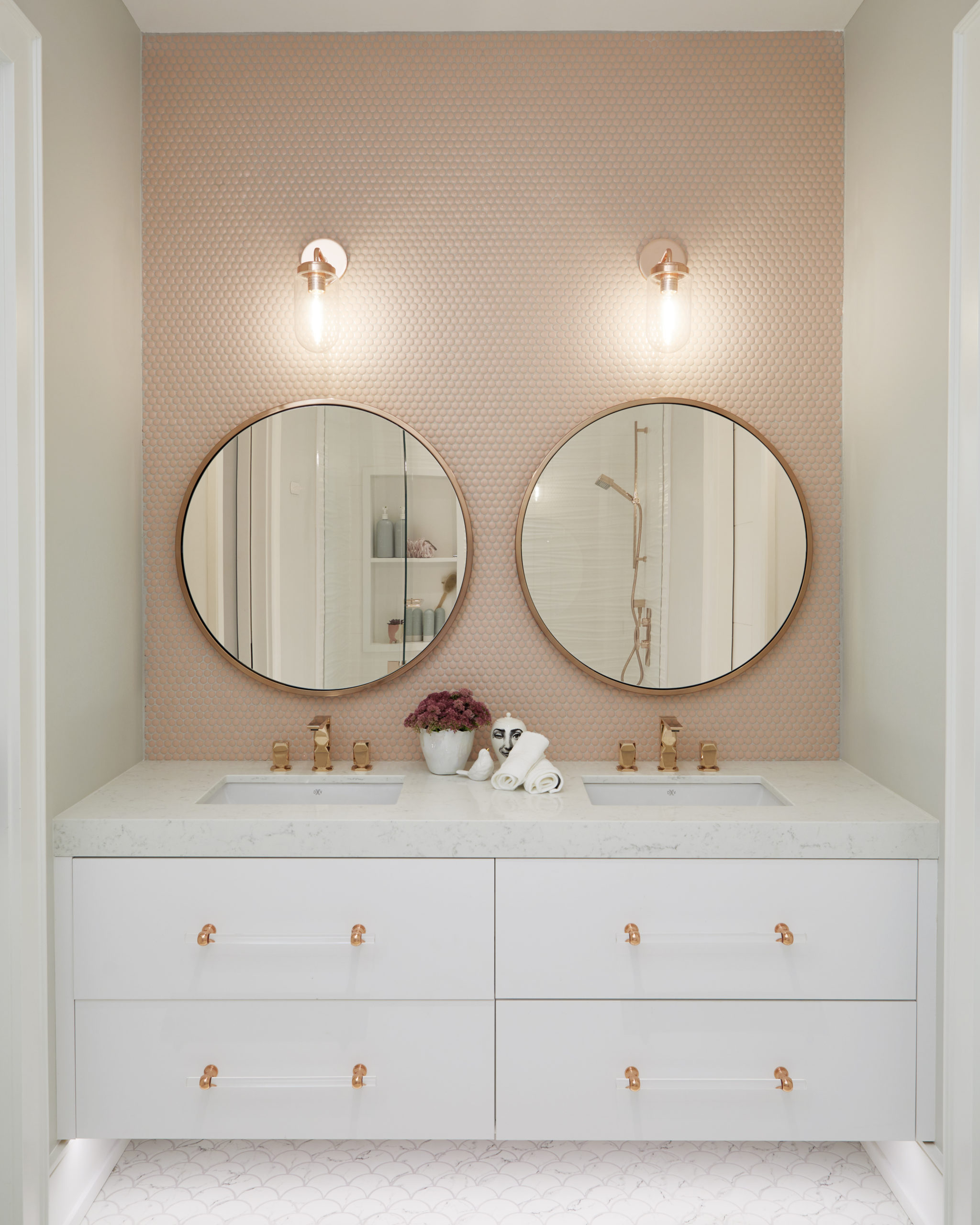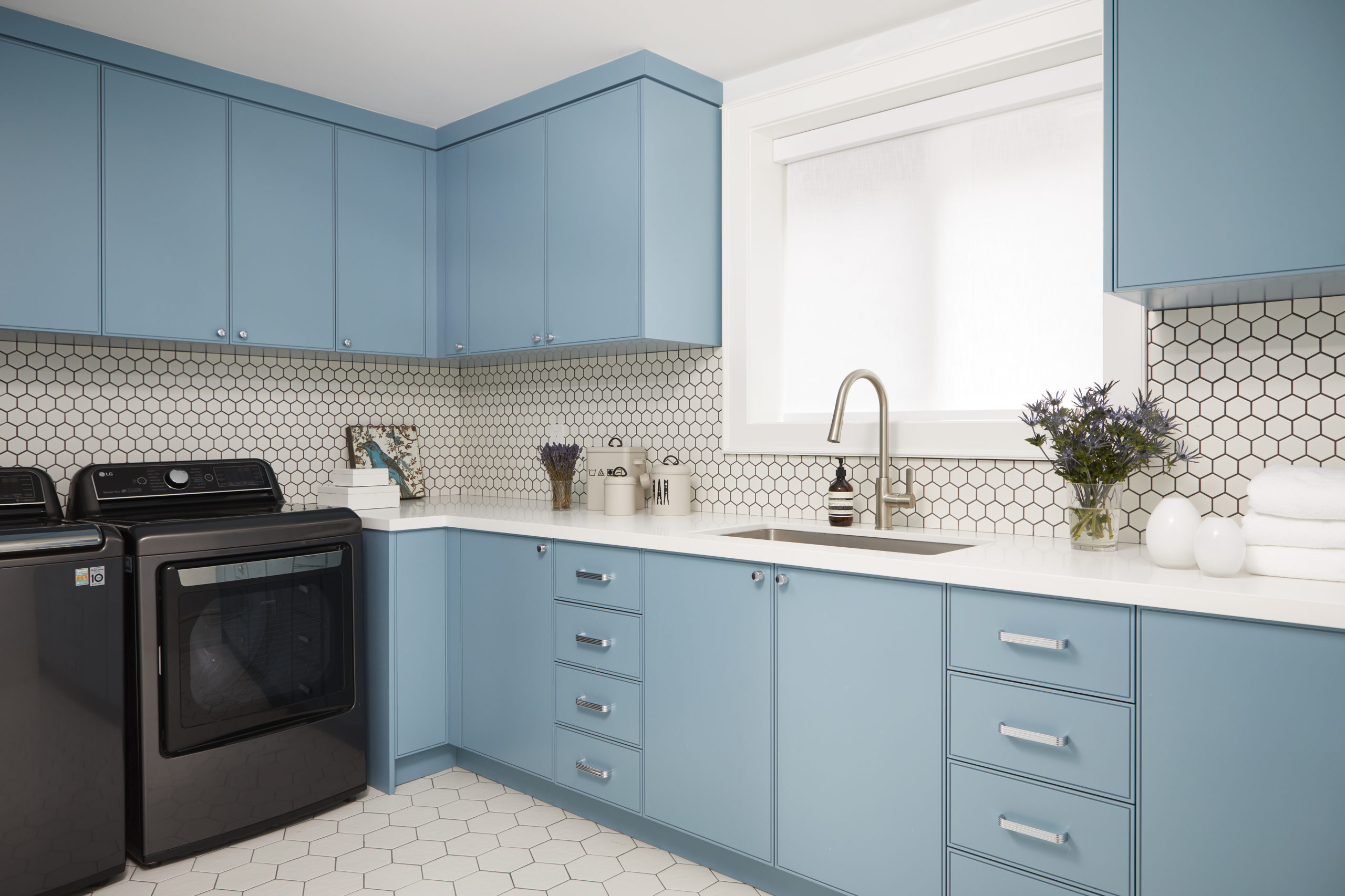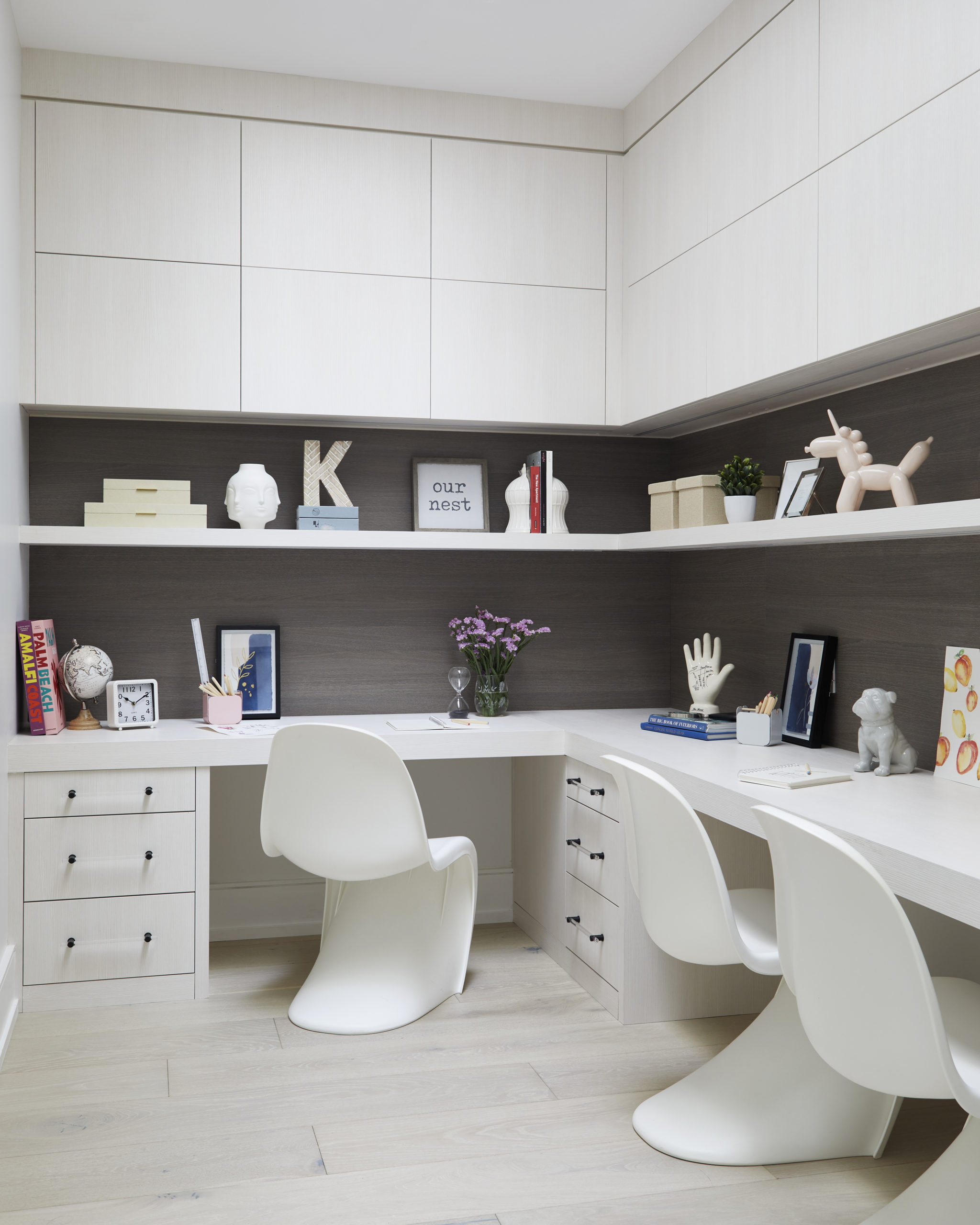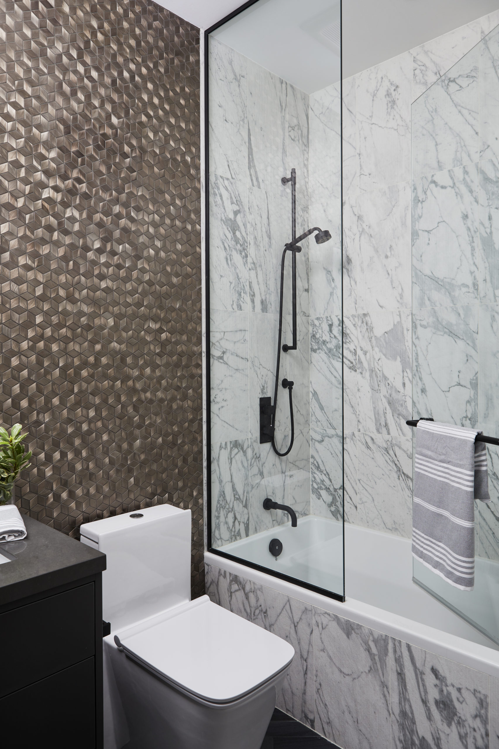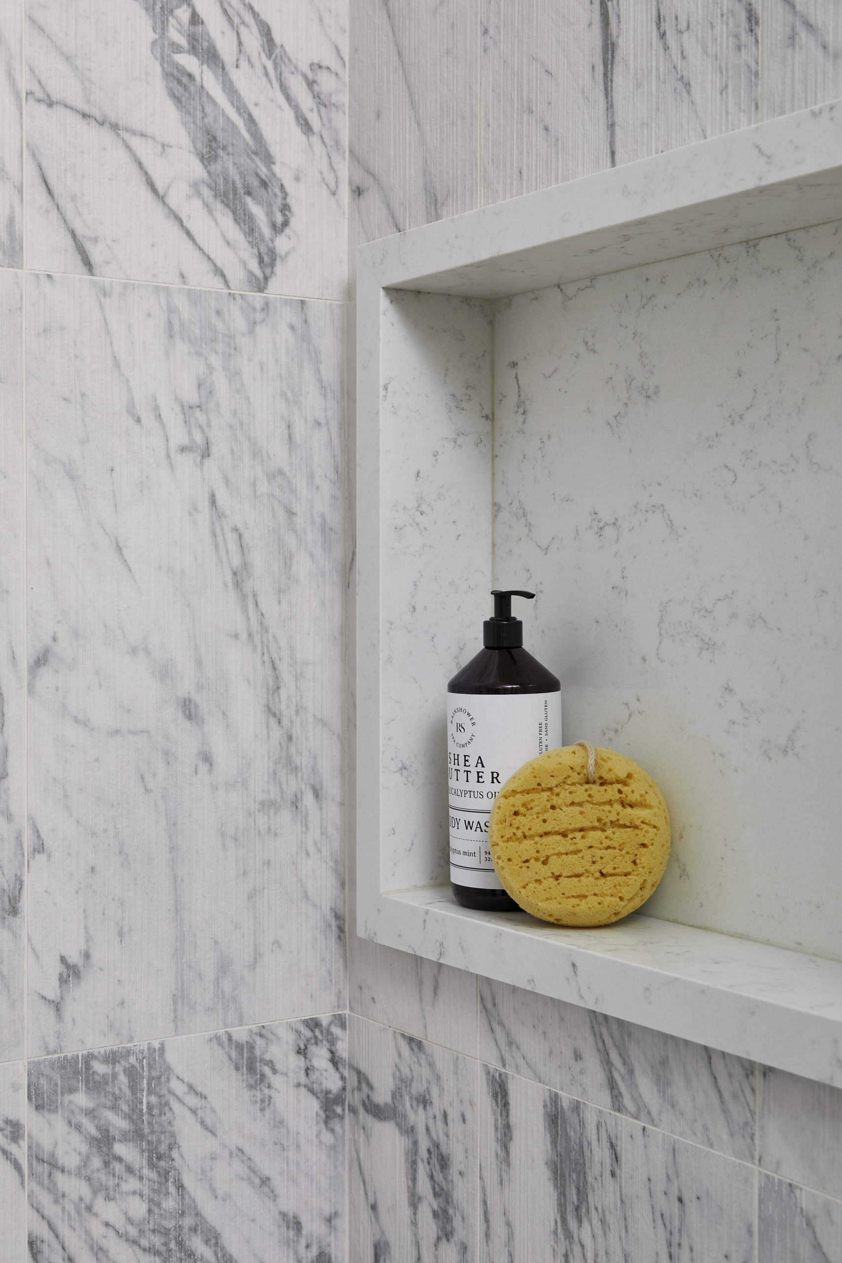 In this expansive 5,000+ sq ft new build, a sleek, modern vision comes to life through a crisp white palette accented by bold dark details and warm brass touches. The kitchen stuns with bright natural stone with linear veins wrapping the countertops, waterfall island, and backsplash, while charcoal-stained wood injects drama and depth. Just opposite, a striking Nero Marquina, black-and-white stone fireplace becomes a timeless focal point. Chevron floors sweep through the corridors, drawing the eye forward with dynamic elegance. In the primary ensuite, fresh white marble envelops the space from floor to ceiling, where minimalist detailing allows the refined materials and thoughtful finishes to quietly command attention.