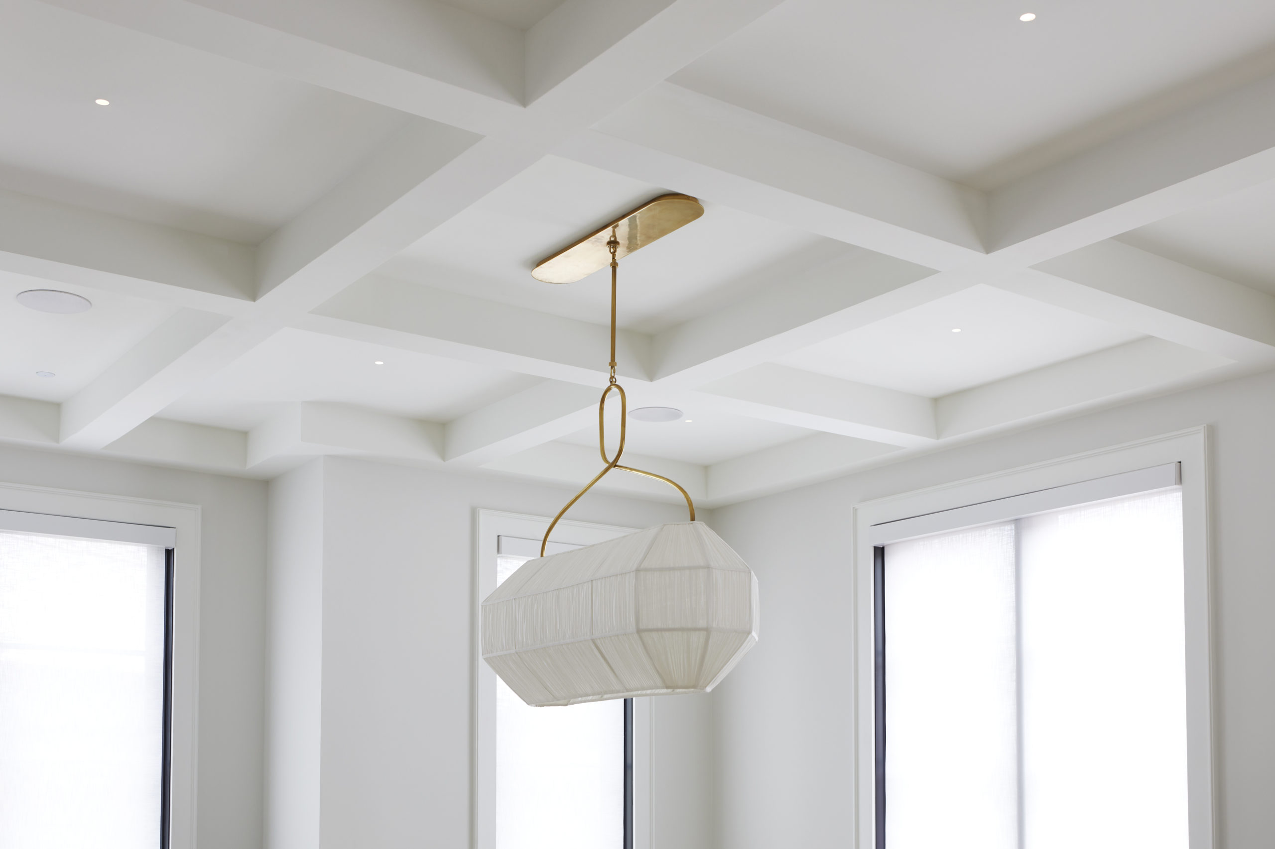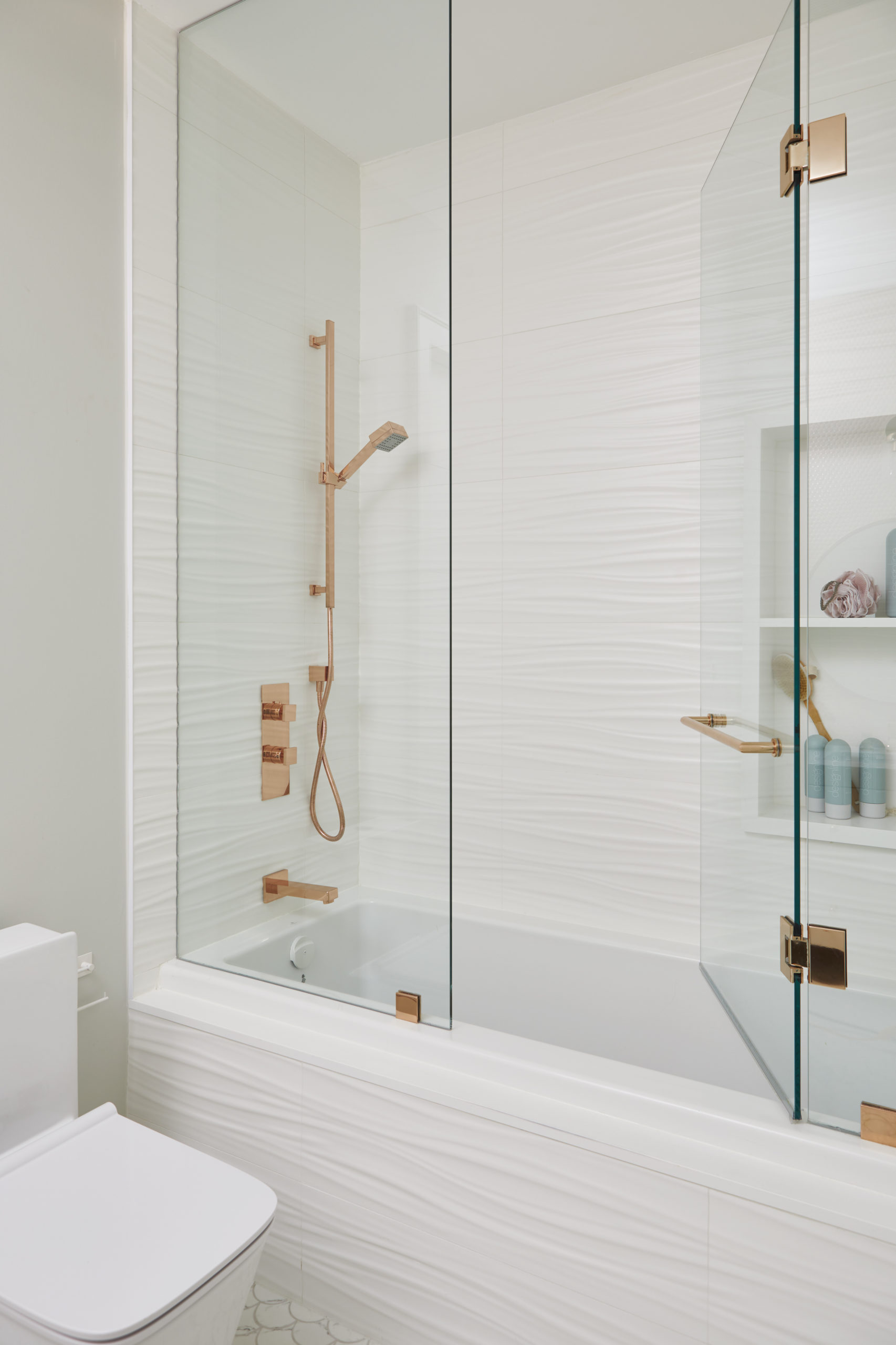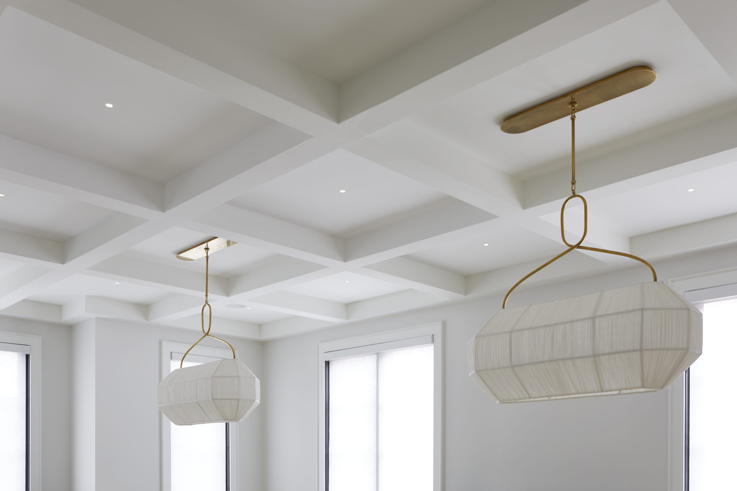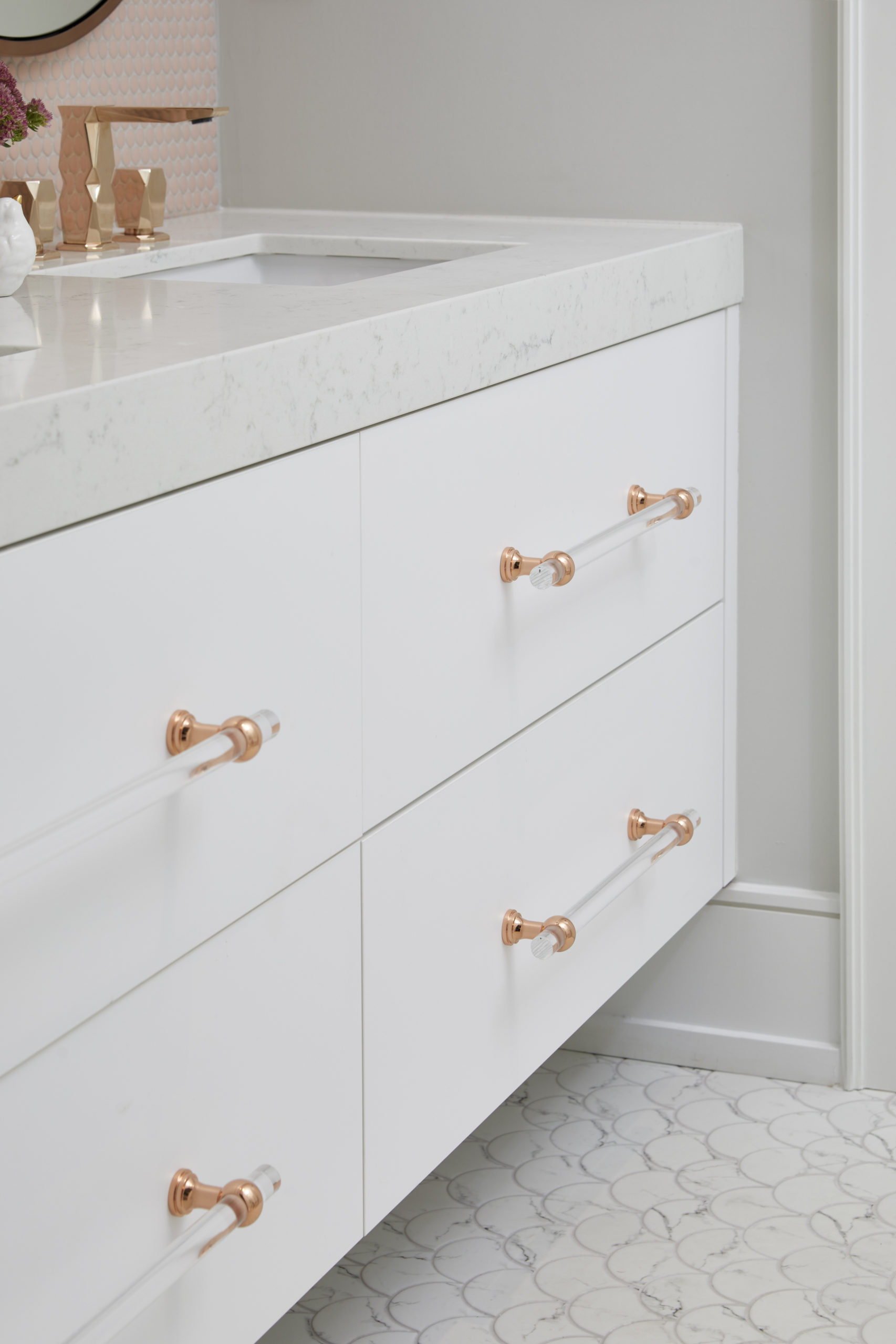 In this expansive 5,000+ sq ft new build, a sleek, modern vision comes to life through a crisp white palette accented by bold dark details and warm brass touches. The kitchen stuns with bright natural stone with linear veins wrapping the countertops, waterfall island, and backsplash, while charcoal-stained wood injects drama and depth. Just opposite, a striking Nero Marquina, black-and-white stone fireplace becomes a timeless focal point. Chevron floors sweep through the corridors, drawing the eye forward with dynamic elegance. In the primary ensuite, fresh white marble envelops the space from floor to ceiling, where minimalist detailing allows the refined materials and thoughtful finishes to quietly command attention.
