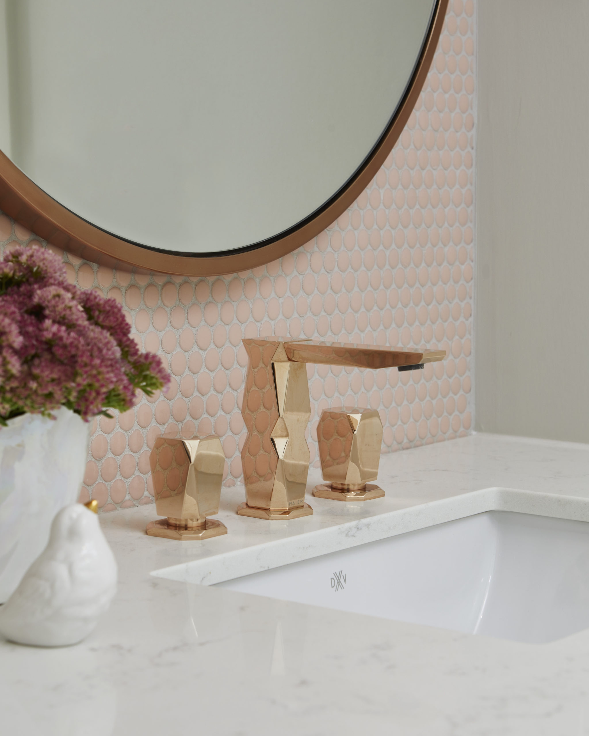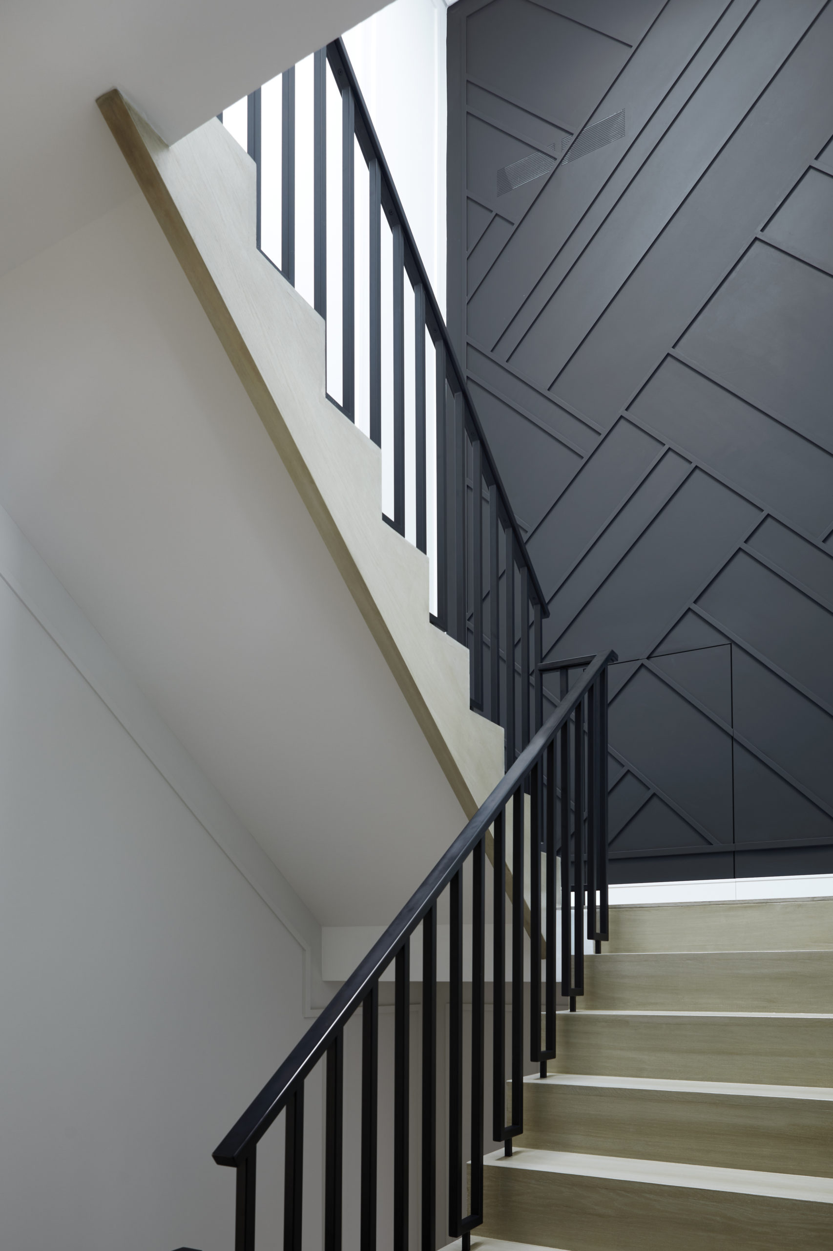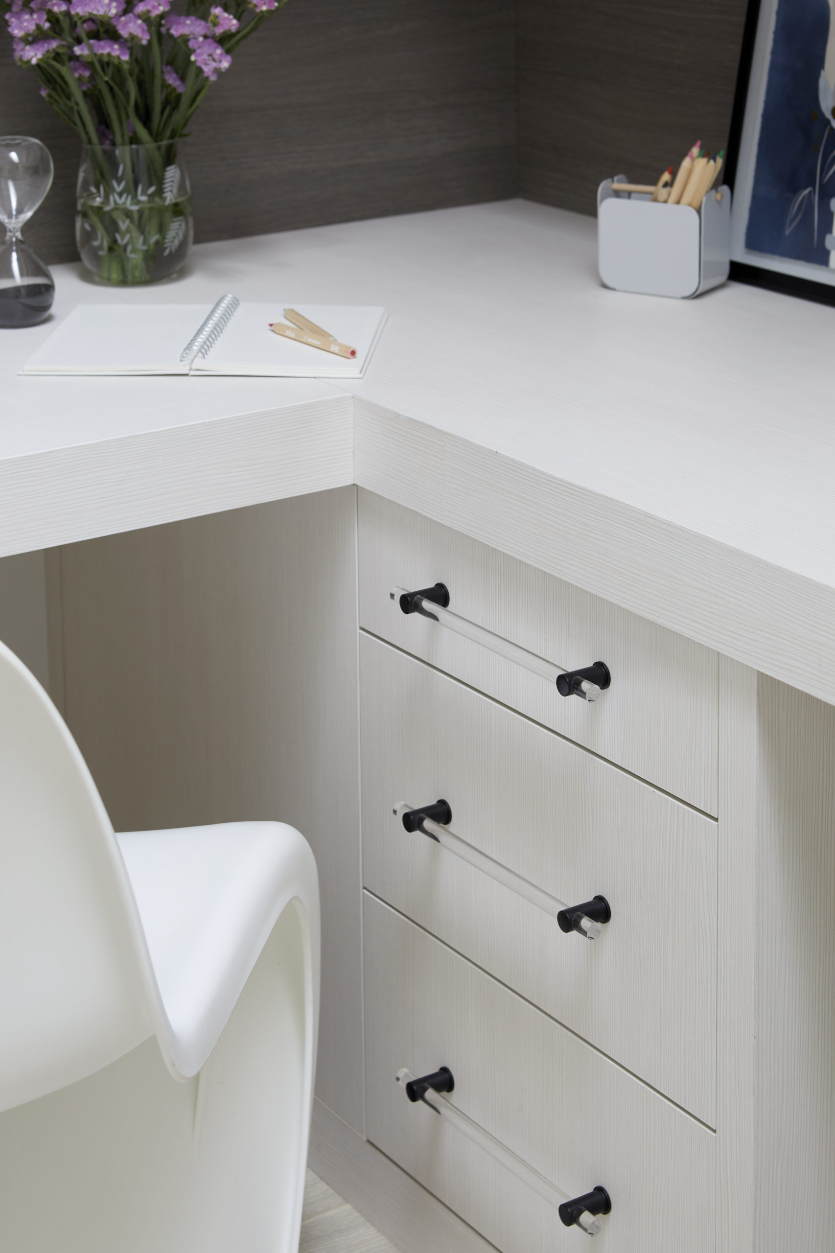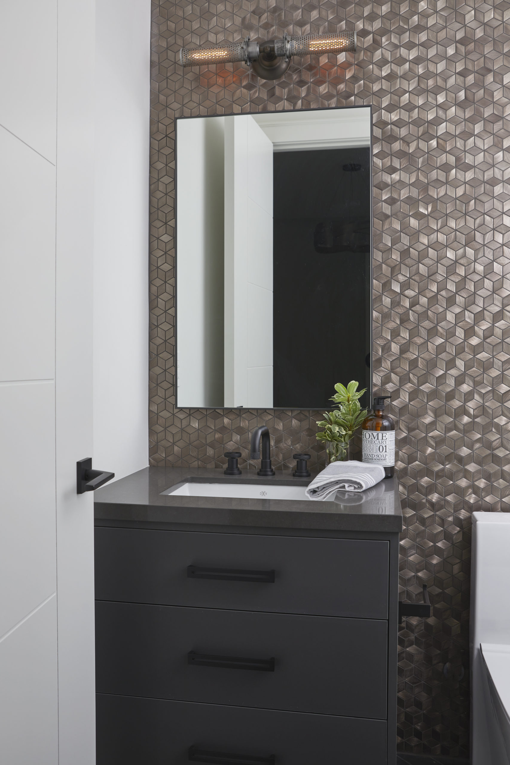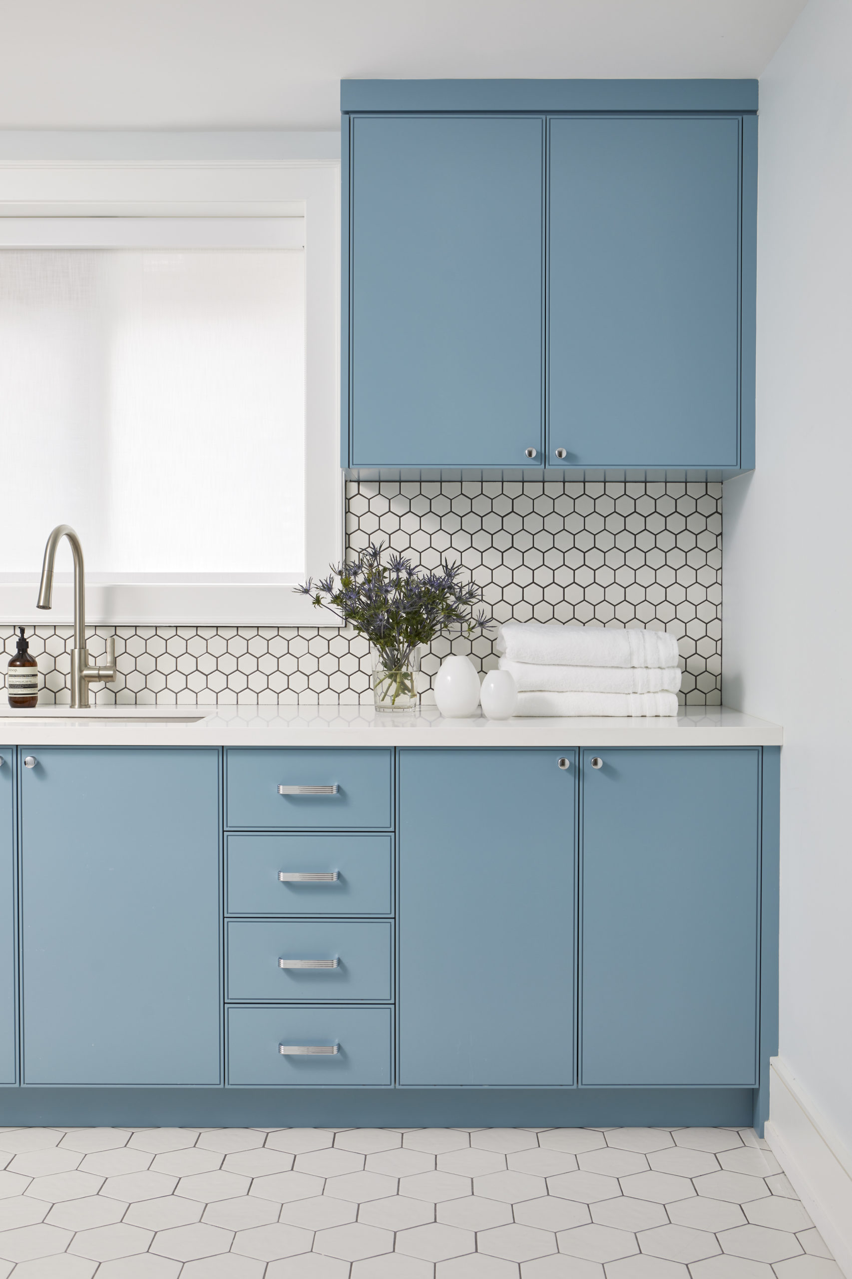 In this expansive 5,000+ sq ft new build, a sleek, modern vision comes to life through a crisp white palette accented by bold dark details and warm brass touches. The kitchen stuns with bright natural stone with linear veins wrapping the countertops, waterfall island, and backsplash, while charcoal-stained wood injects drama and depth. Just opposite, a striking Nero Marquina, black-and-white stone fireplace becomes a timeless focal point. Chevron floors sweep through the corridors, drawing the eye forward with dynamic elegance. In the primary ensuite, fresh white marble envelops the space from floor to ceiling, where minimalist detailing allows the refined materials and thoughtful finishes to quietly command attention.