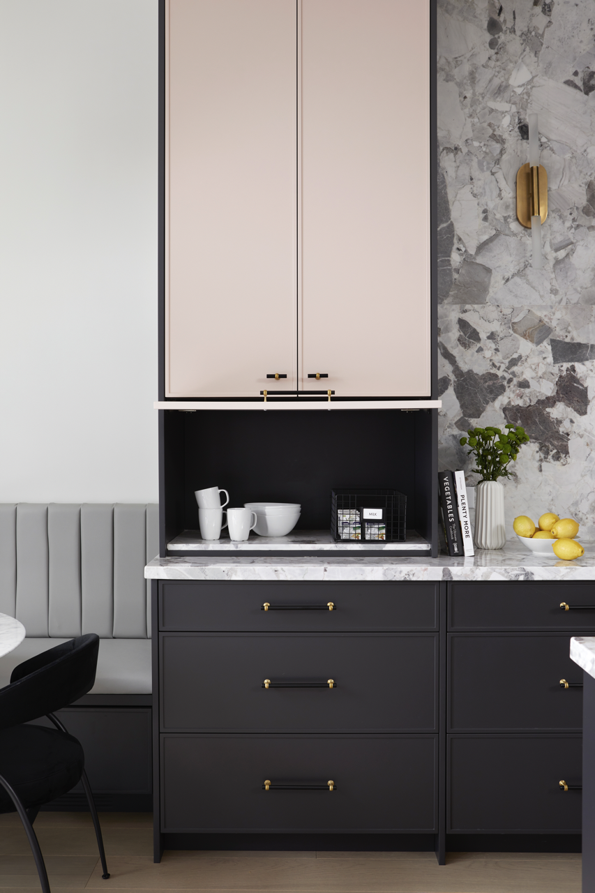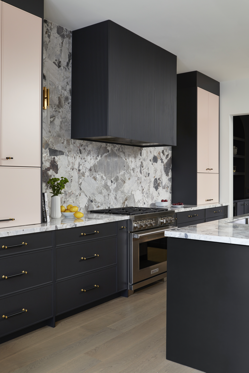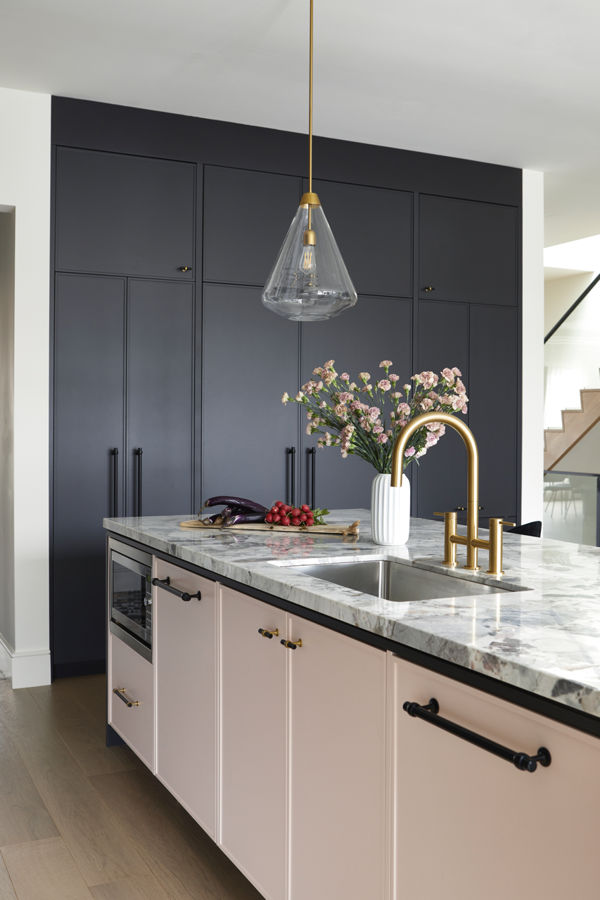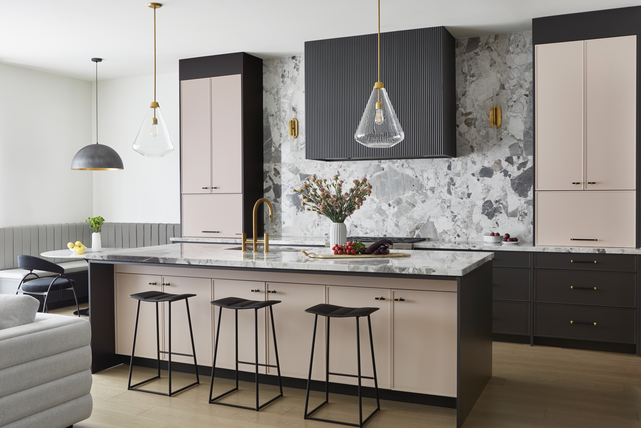 At the center of the home is a striking pink and black kitchen, elevated by dramatic marble surfaces and rich, thoughtful detailing. This statement space sets the tone for the entire home, fearless, elegant, and full of personality. Playful design elements like wallpapered ceilings and artistic lighting choices add layers of visual interest and charm, infusing every room with a sense of individuality.