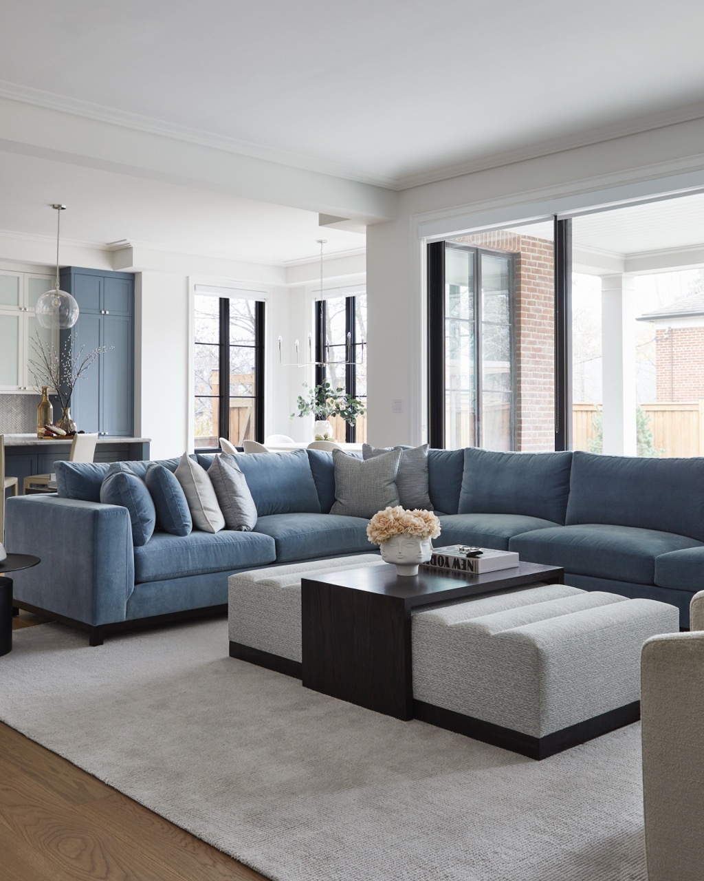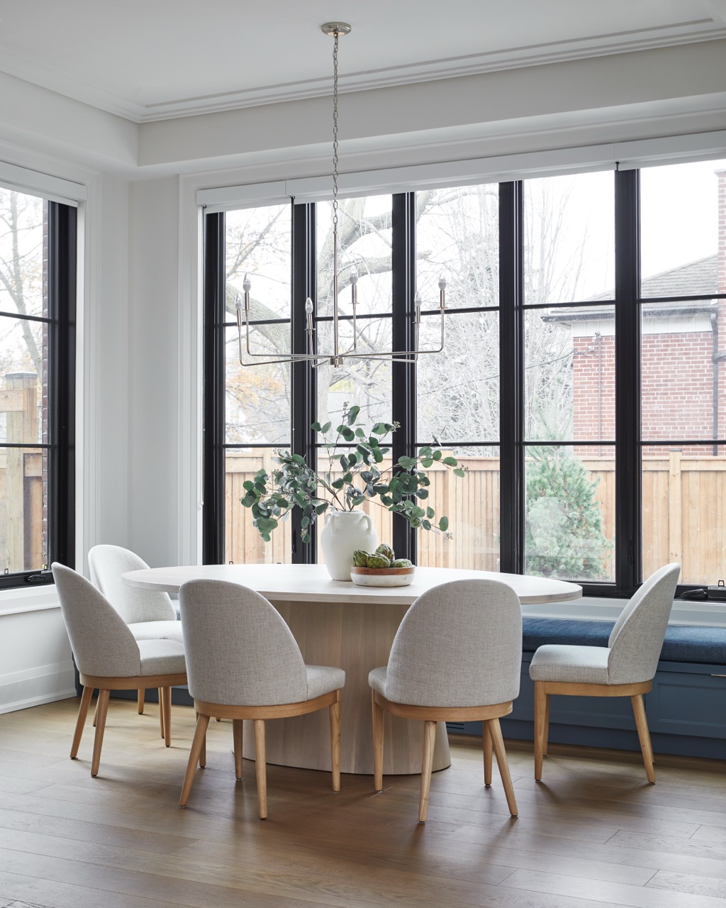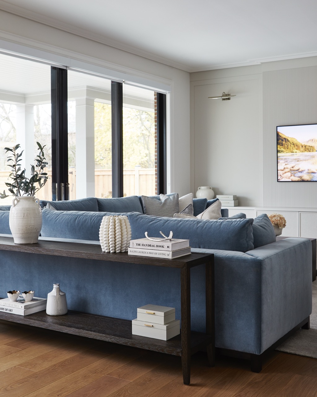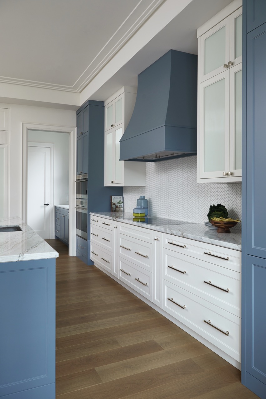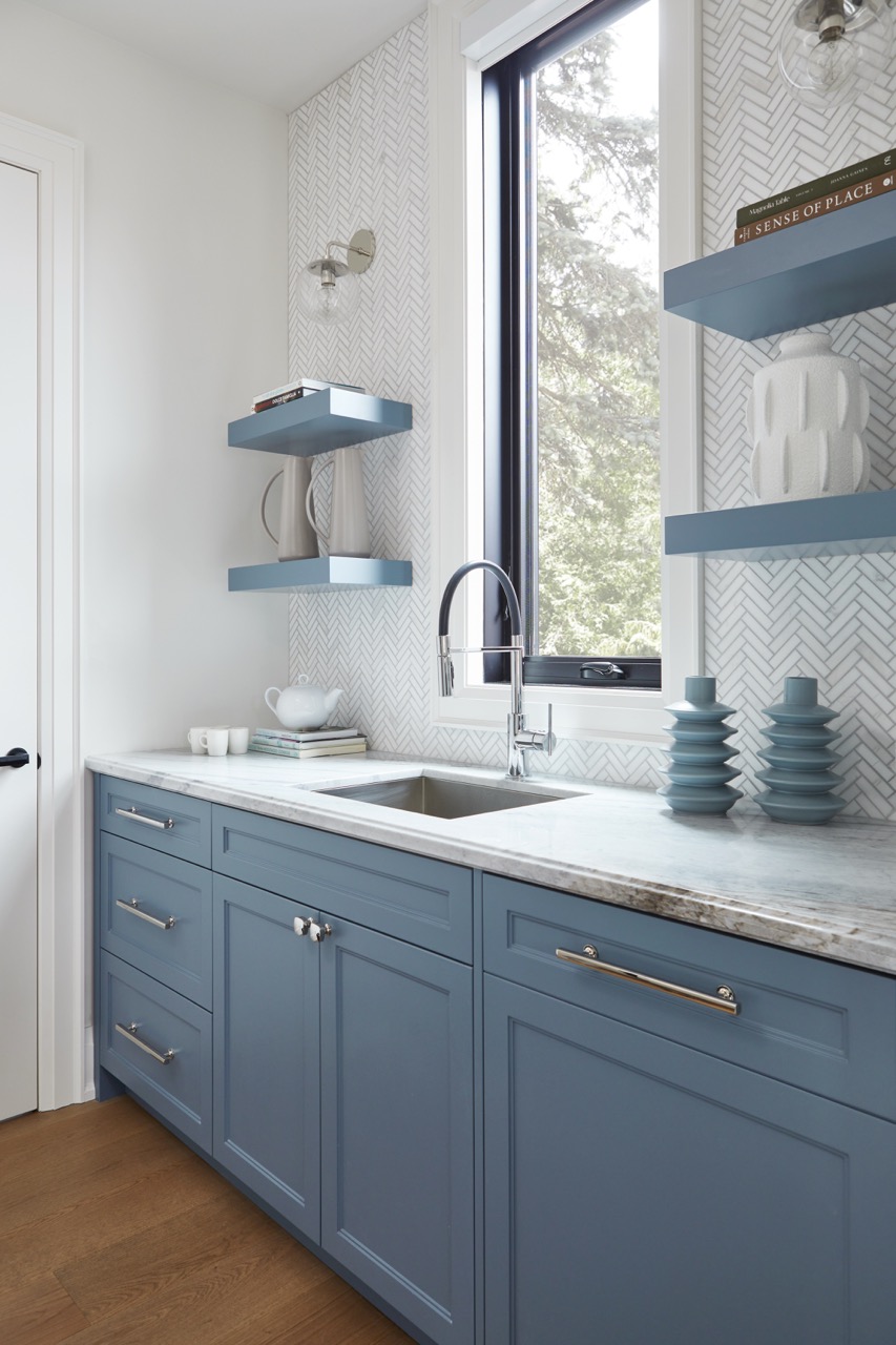 Project Cedervale blends contemporary and transitional design with bold, thoughtful details. A deep blue runs throughout the home, seen in custom millwork and carefully selected furnishings, adding richness and character. In the dining room, wallpapered panels bring depth and softness, while beautiful natural stone tiles were custom designed to accent key spaces. The result is a refined, cohesive interior that feels timeless, layered, and distinctly personal.