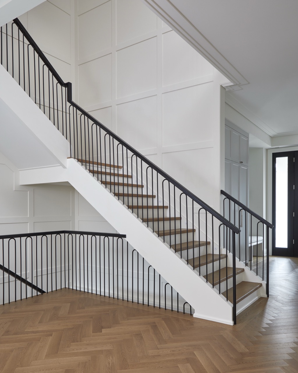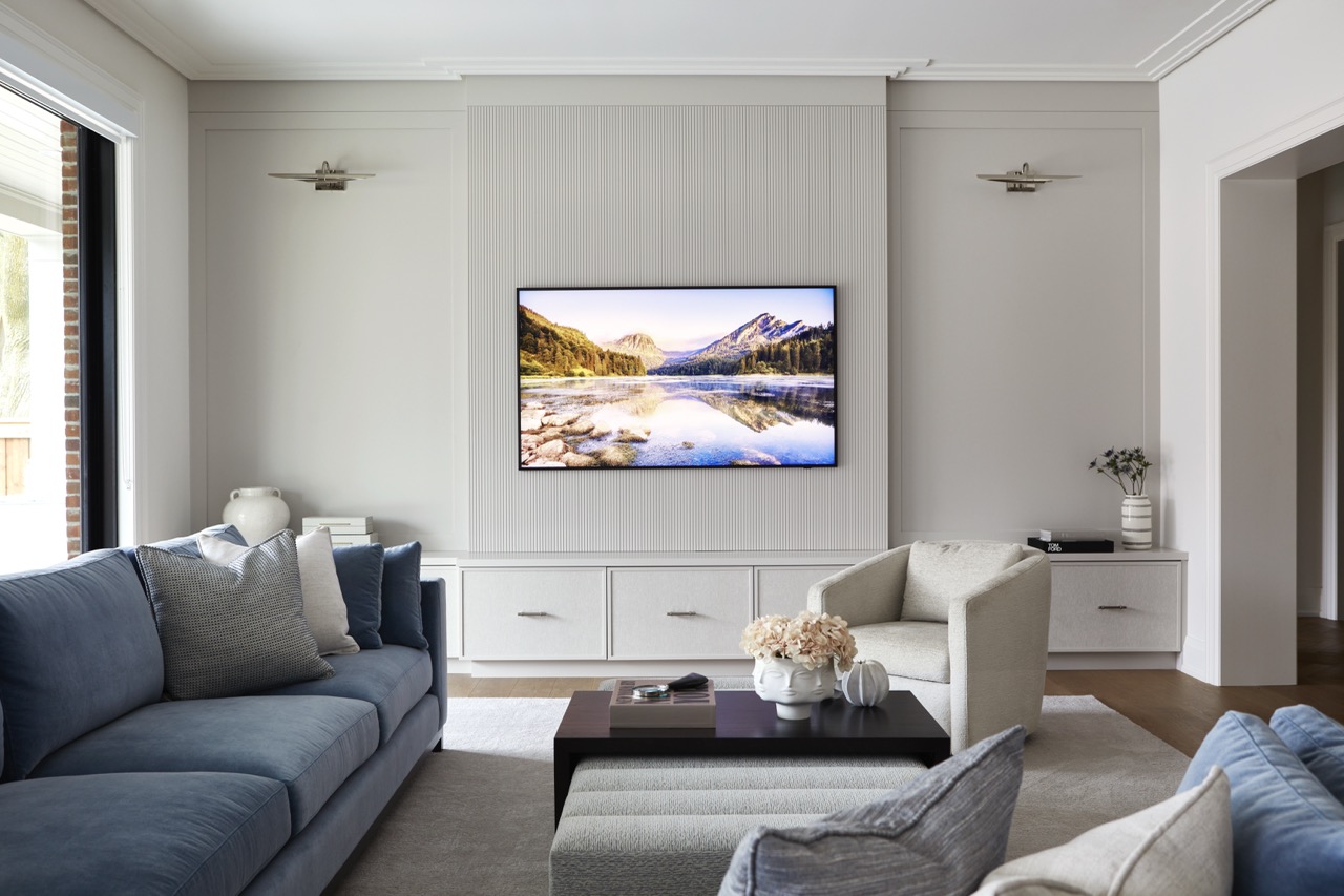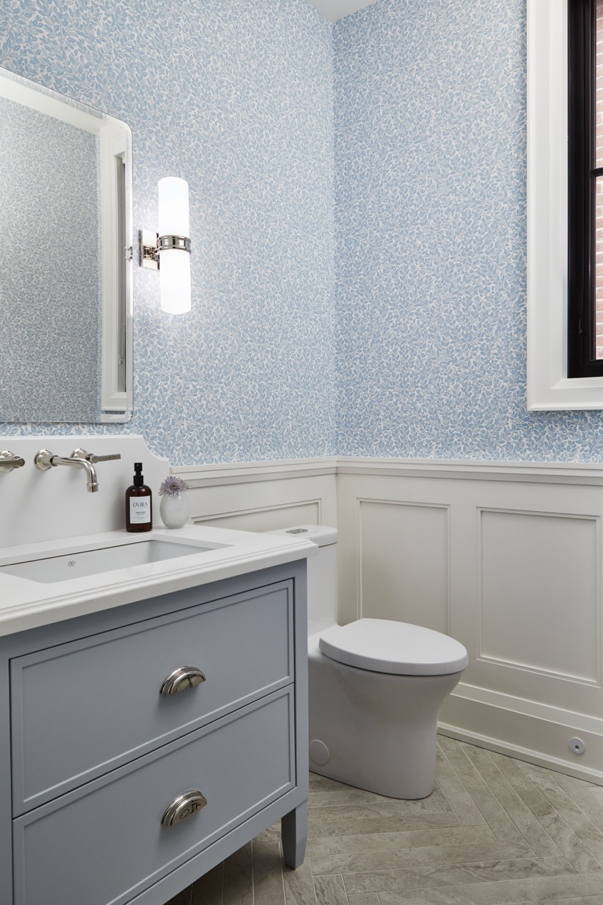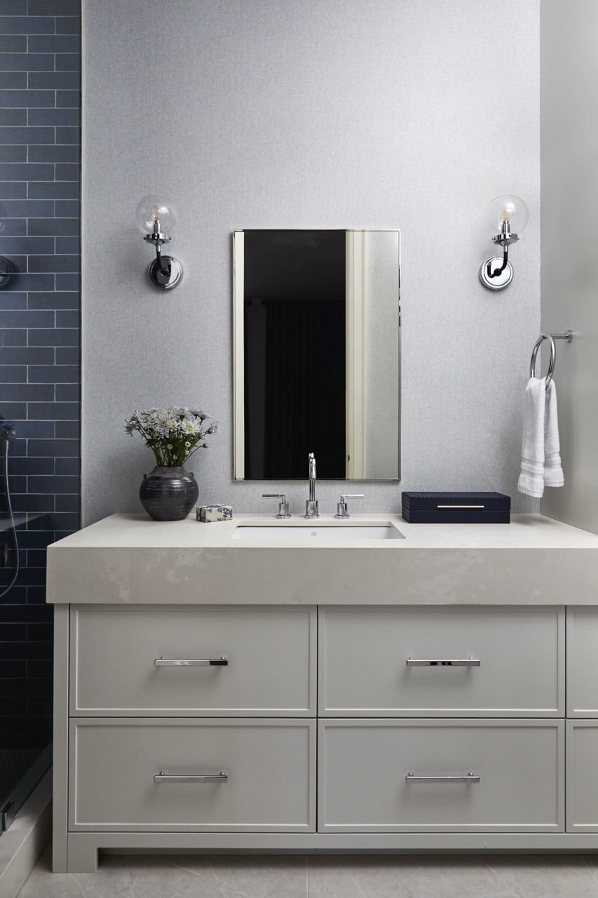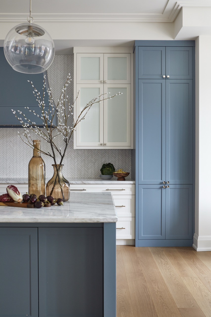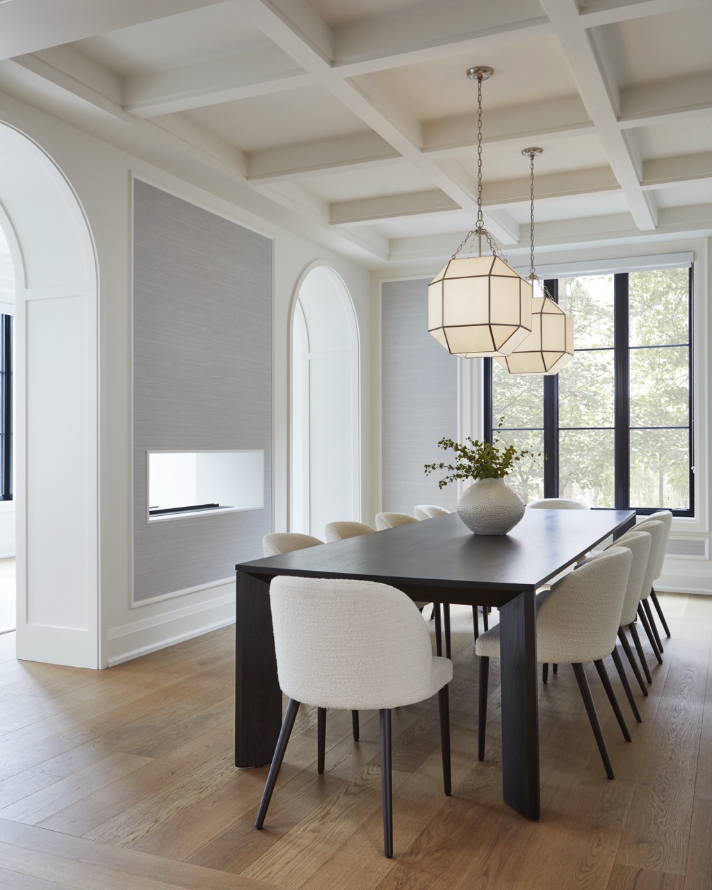 Project Cedervale blends contemporary and transitional design with bold, thoughtful details. A deep blue runs throughout the home, seen in custom millwork and carefully selected furnishings, adding richness and character. In the dining room, wallpapered panels bring depth and softness, while beautiful natural stone tiles were custom designed to accent key spaces. The result is a refined, cohesive interior that feels timeless, layered, and distinctly personal.