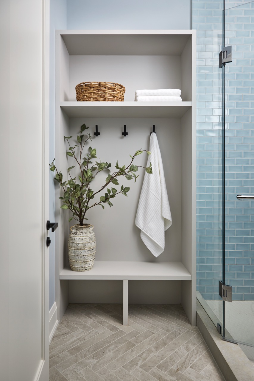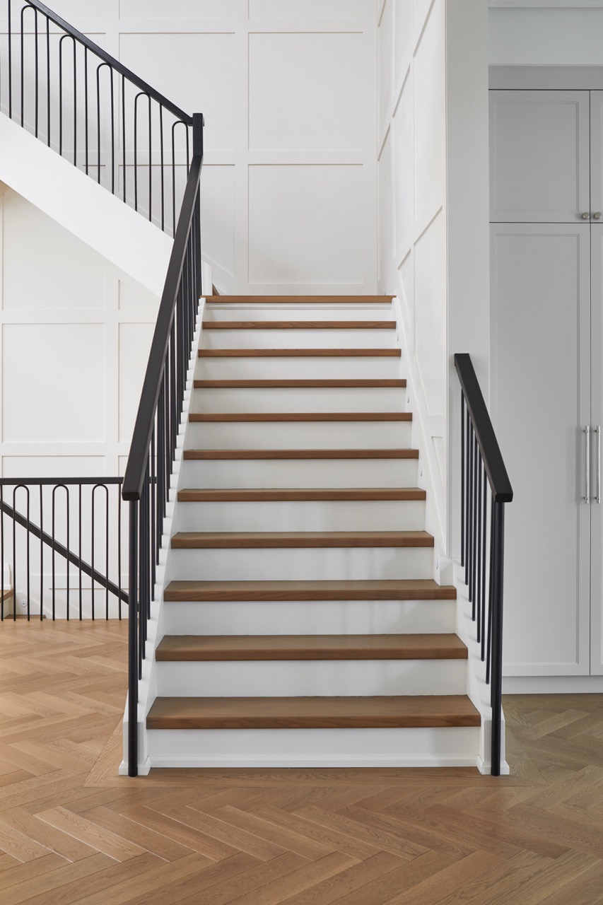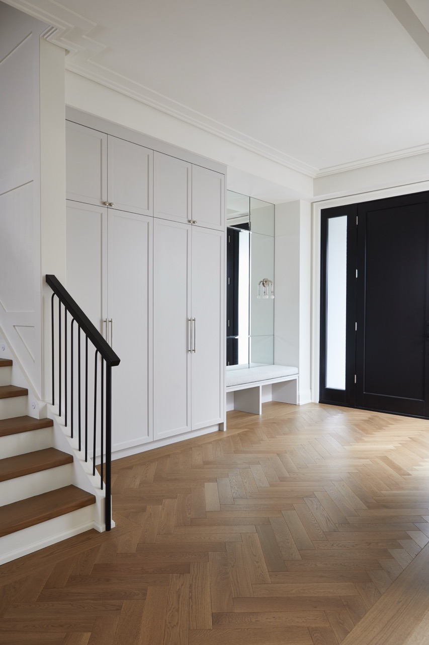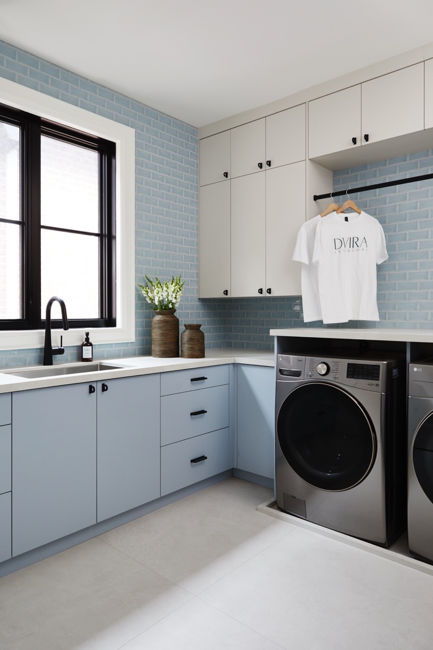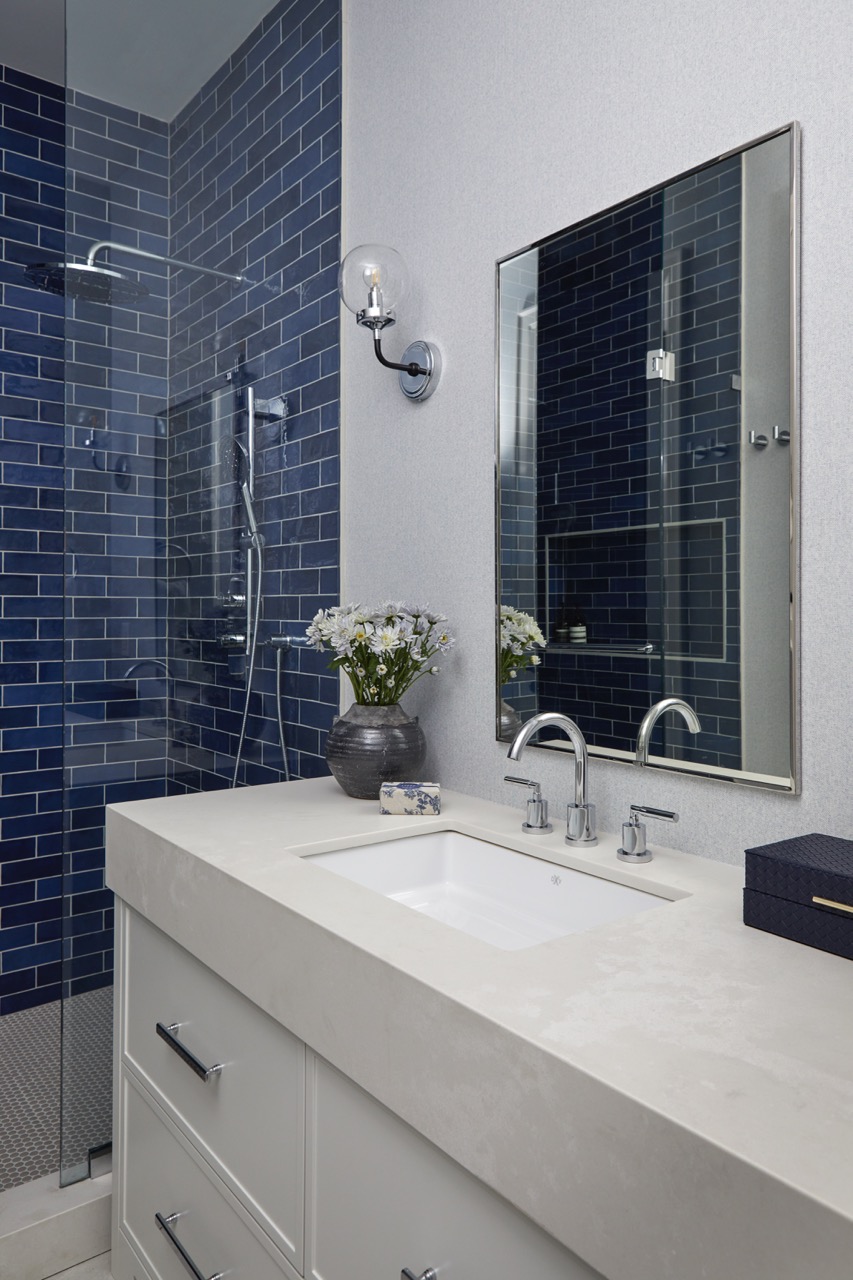 Project Cedervale blends contemporary and transitional design with bold, thoughtful details. A deep blue runs throughout the home, seen in custom millwork and carefully selected furnishings, adding richness and character. In the dining room, wallpapered panels bring depth and softness, while beautiful natural stone tiles were custom designed to accent key spaces. The result is a refined, cohesive interior that feels timeless, layered, and distinctly personal.