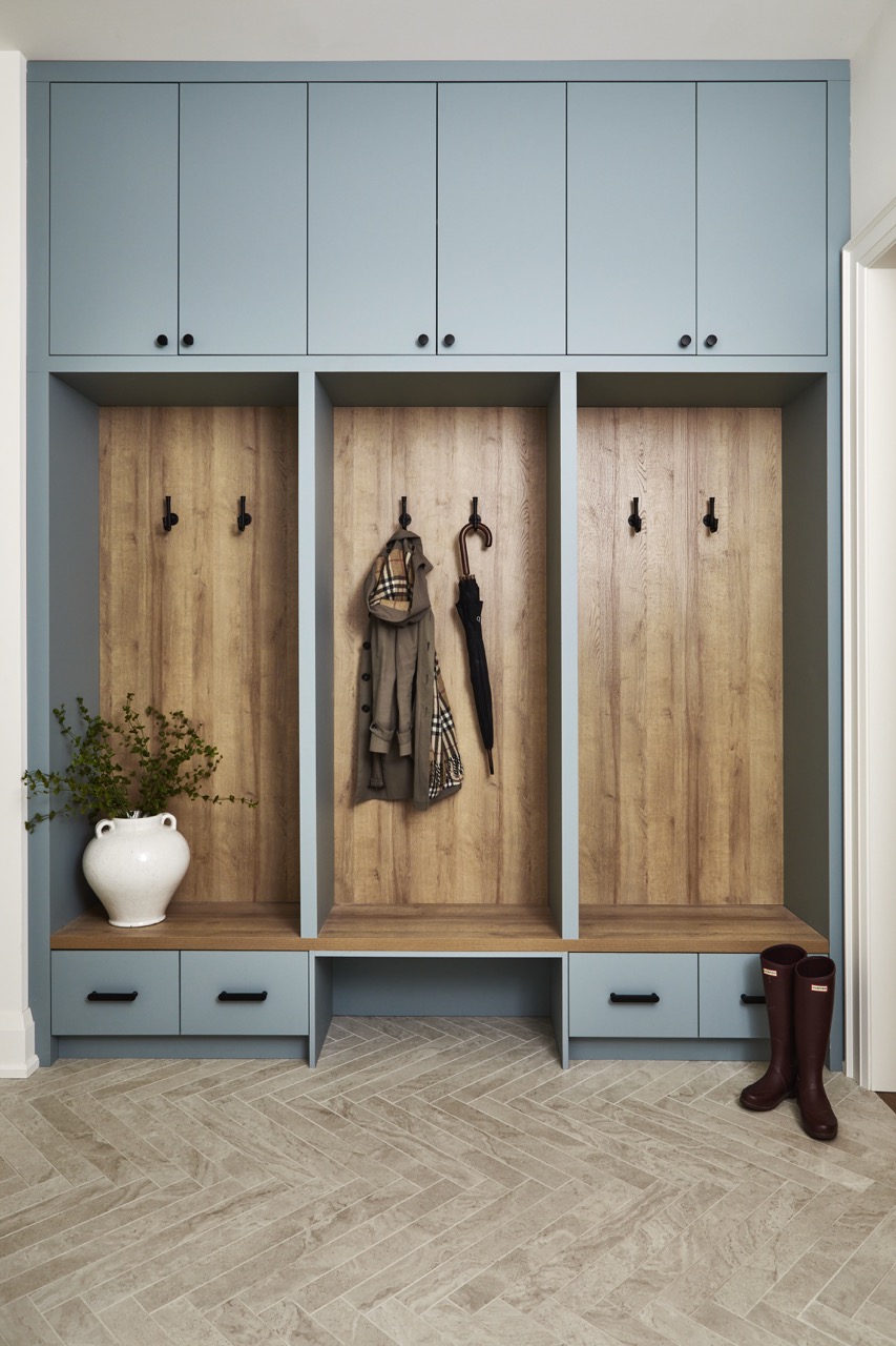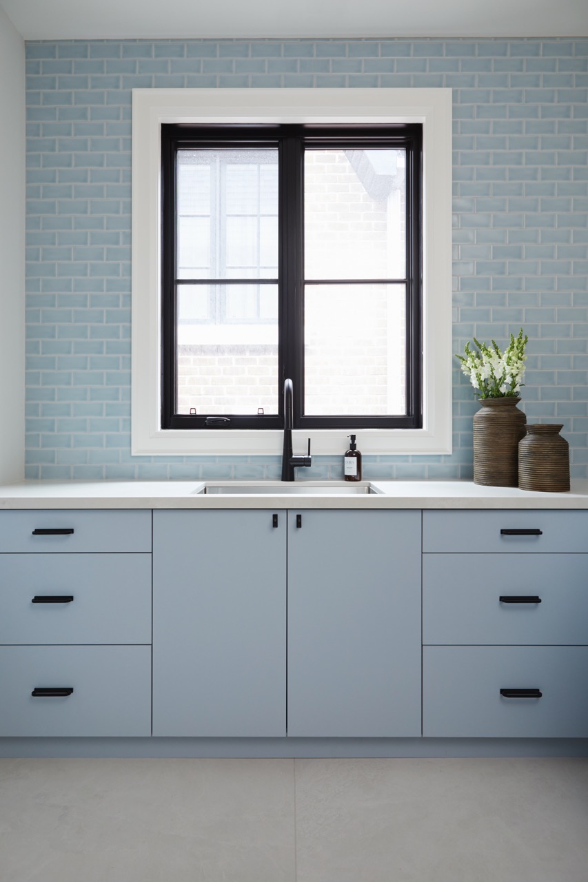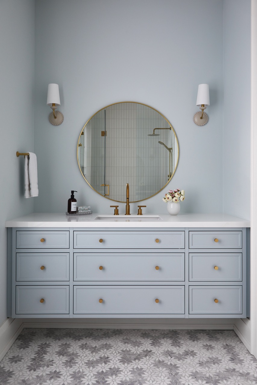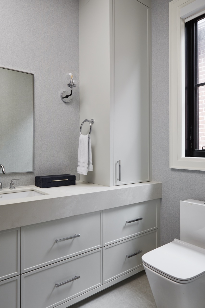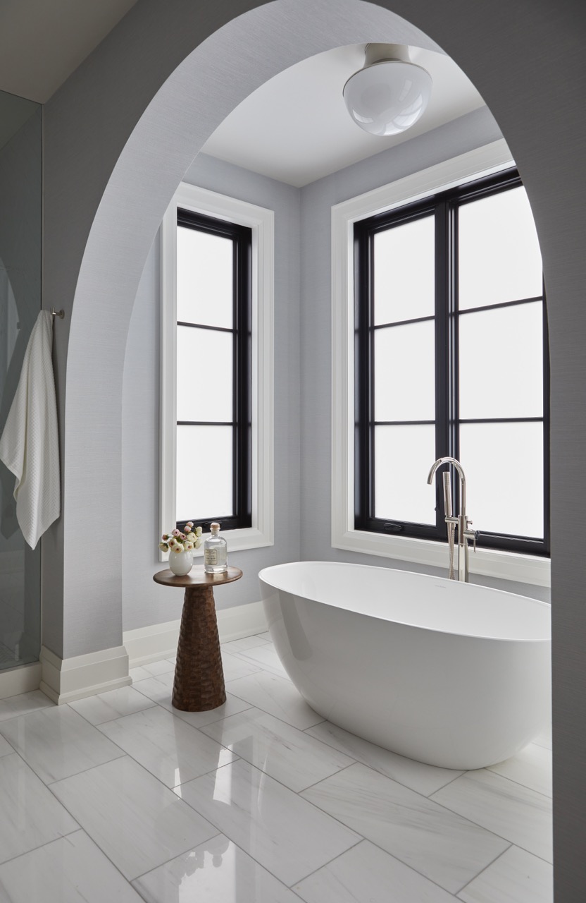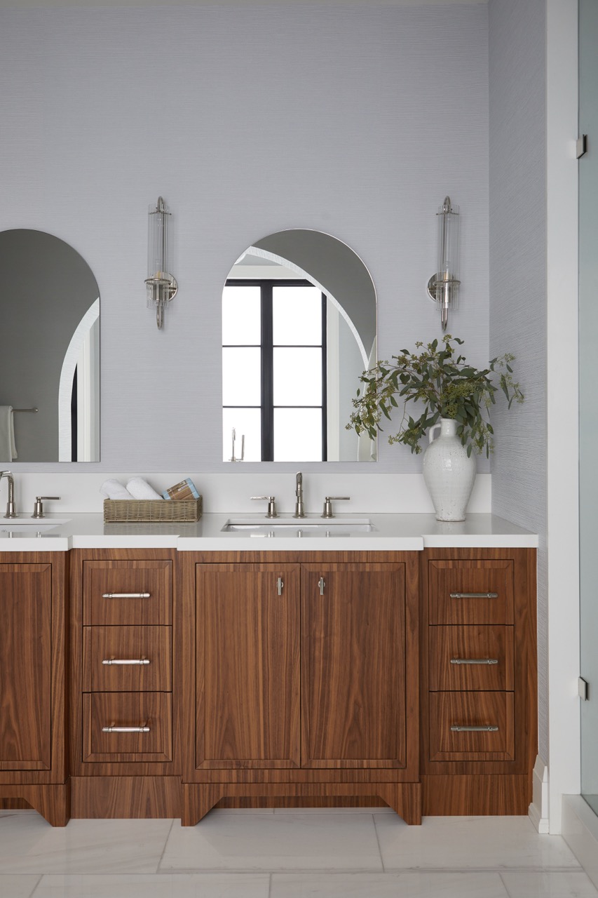Project Cedervale blends contemporary and transitional design with bold, thoughtful details. A deep blue runs throughout the home, seen in custom millwork and carefully selected furnishings, adding richness and character. In the dining room, wallpapered panels bring depth and softness, while beautiful natural stone tiles were custom designed to accent key spaces. The result is a refined, cohesive interior that feels timeless, layered, and distinctly personal.