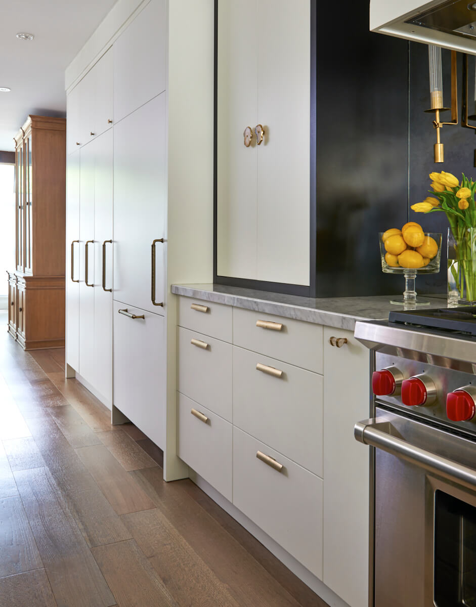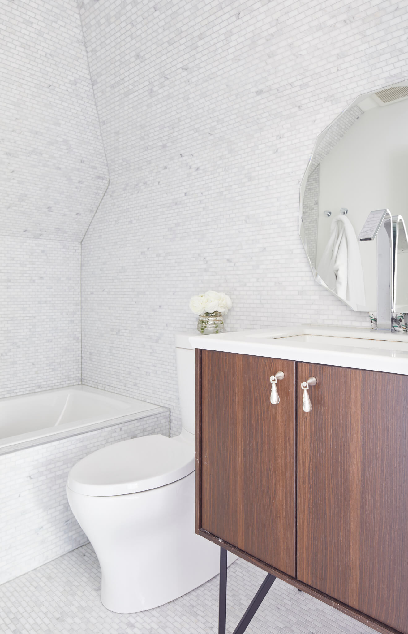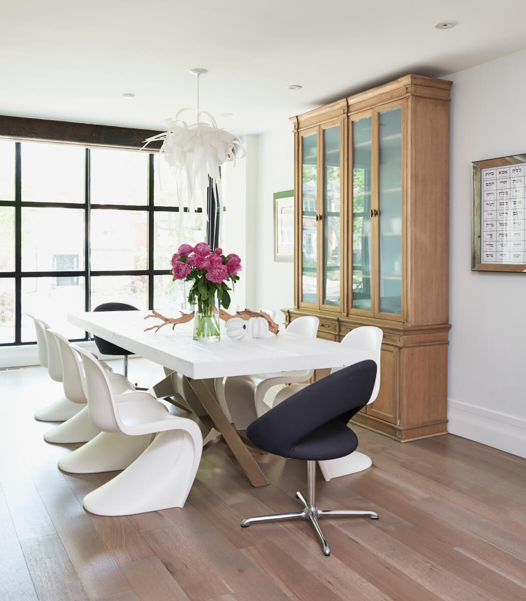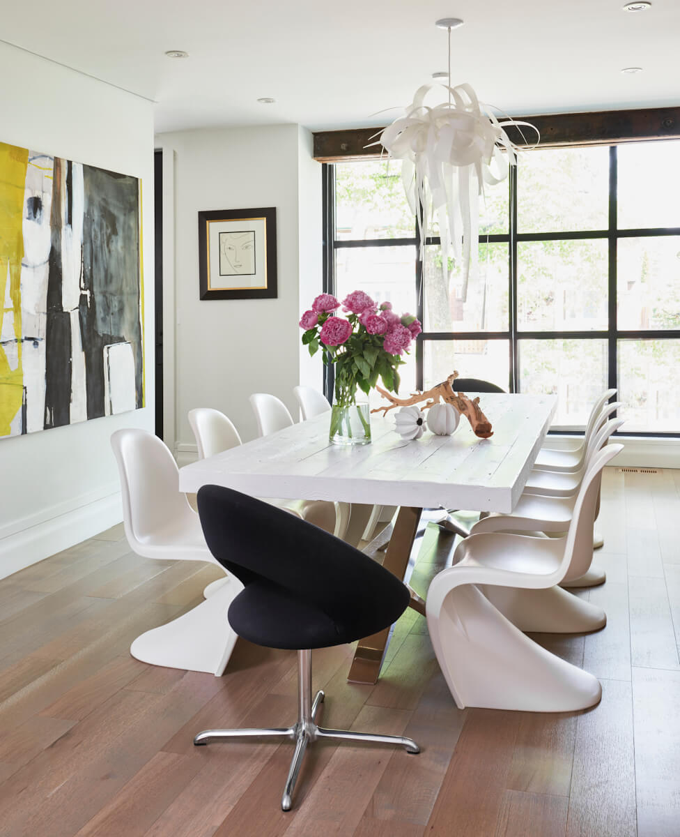 This modern eclectic home in the heart of the city underwent a full transformation, including an 800 sq ft two-story addition that expanded it to 2,800 sq ft. Gutted to the brick, it was reimagined with a practical, family-focused layout featuring a centrally located kitchen that merges multiple design styles with both function and flair. The kitchen, free of typical upper cabinets, showcases full- height pantries, sleek white slab doors, and a dramatic black island trimmed in brass. Cleverly concealed appliances, antique mirror backsplash, vintage Egyptian doors, and layered lighting pendants, sconces, and downlights, all add to its glamour. The adjacent open-concept dining and living spaces balance rustic and modern elements, while the master suite, carved from the addition, is a compact yet luxurious retreat with a double vanity, marble-clad shower featuring a floating seat, and stylish pendant lighting. Each bedroom reflects its user’s style, with the master embracing a fresh, glamorous aesthetic that echoes the home’s blend of modern and eclectic design.